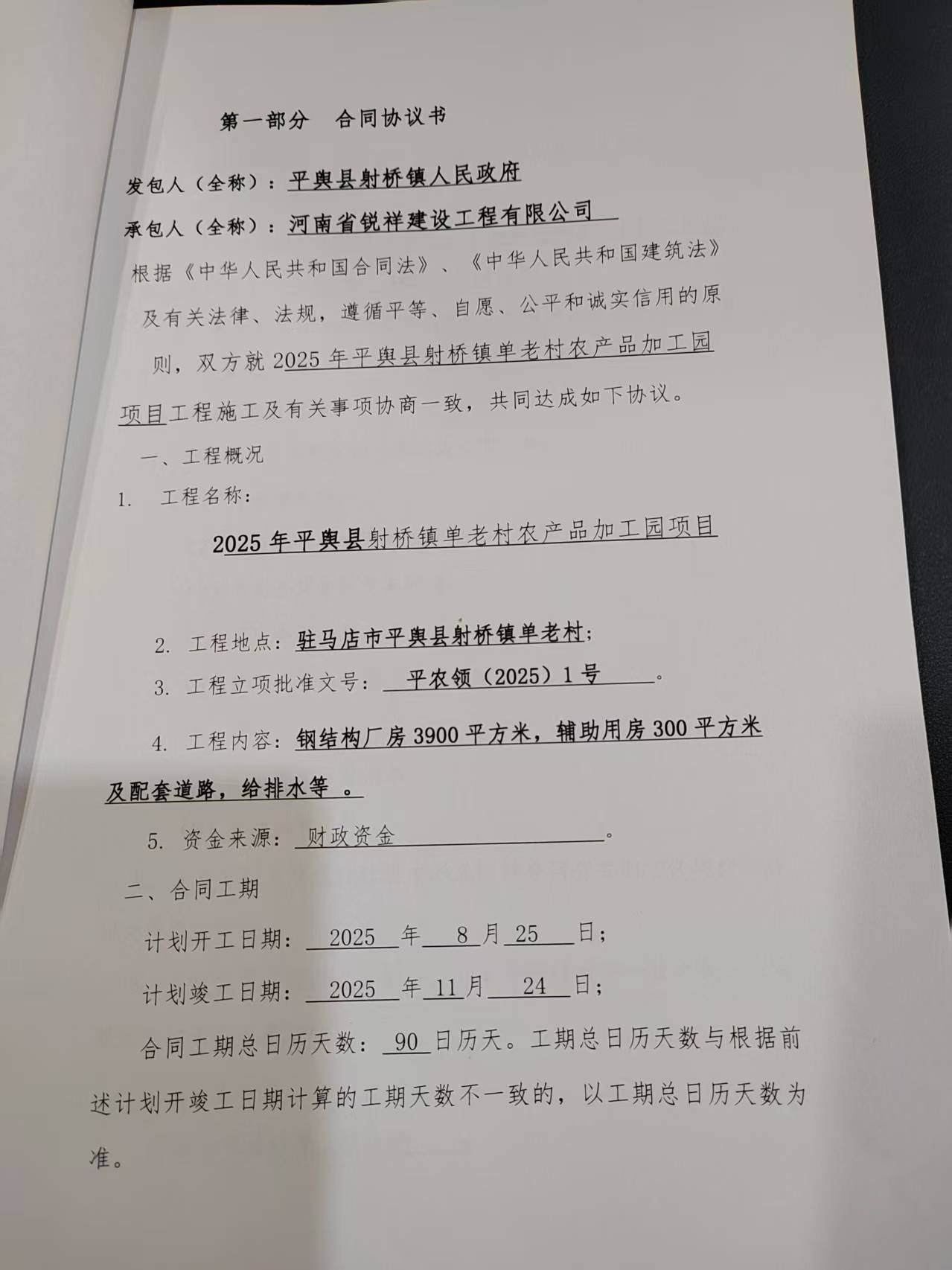 | 二、合同名称:****年平舆县射桥镇单老村农产品加工园项目 | ||||||||||||