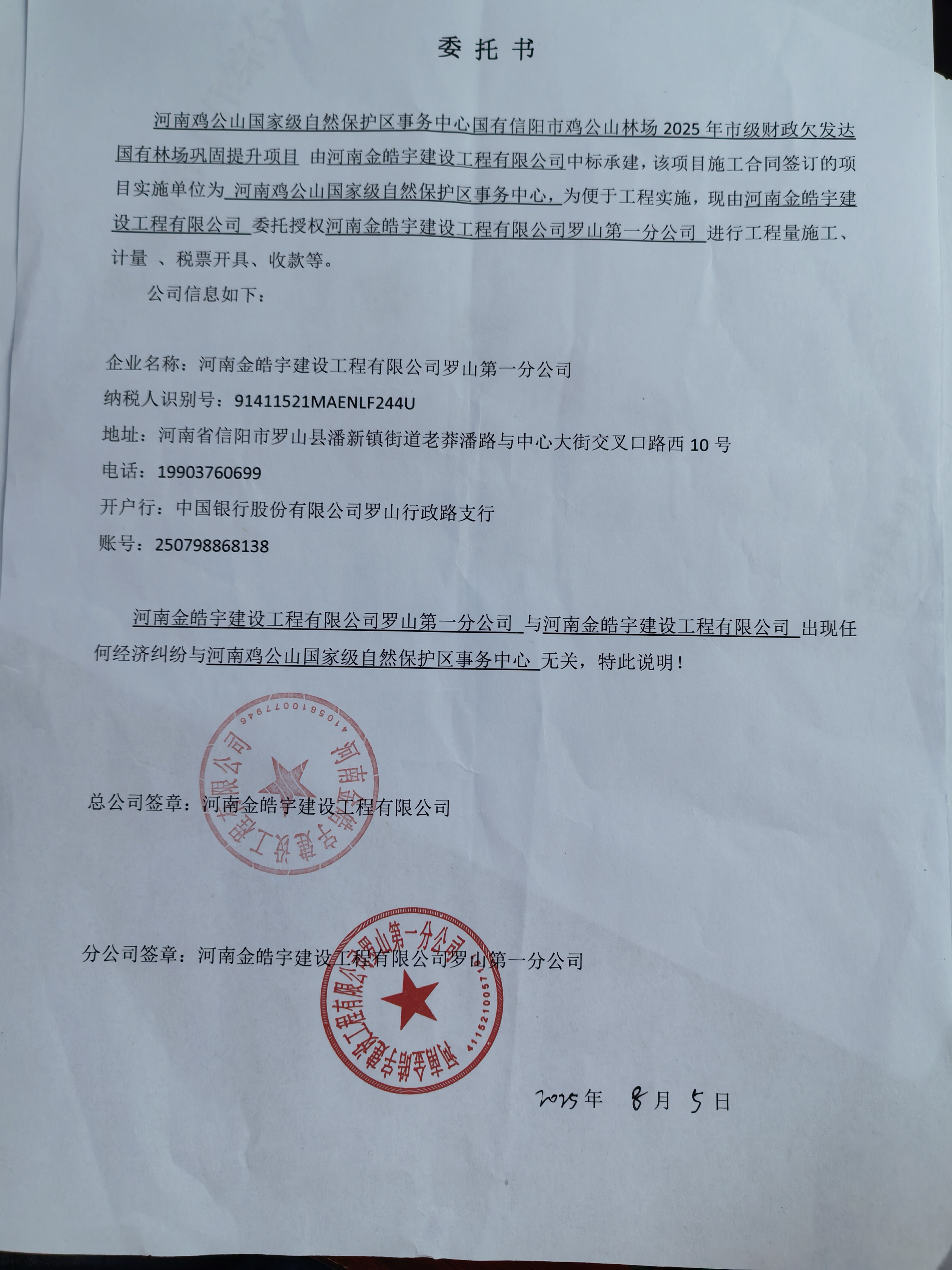 | 为便于工程实施,现由河南金皓宇建设工程有限公司委托授权河南金皓宇建设工程有限公司罗山第一分公司进行工程量施工、计量、税票开具、收款等 |