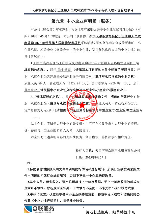受天津市滨海新区小王庄镇人民政府委托,天津市滨海新区政府采购中心以公开招标方式,对天津市滨海新区小王庄镇人民政府采购****年示范镇人居环境管理项目实施采购,现将中标结果公布如下: 一、项目名称和编号 *.项目名称:天津市滨海新区小王庄镇人民政府采购****年示范镇人居环境管理项目 *.项目编号:**************** 二、中标信息 *.中标供应商名称:天津滨海众联产业服务有限公司 *.中标供应商地址:天津经济技术开发区中区轻一街***号轻纺大厦*******室 *.供应商评审报价、评审总得分及排序情况:见附件 *.主要中标标的名称、规格型号、数量、单价、服务要求或者标的基本概况:物业管理服务 三、评标委员会成员名单 朱禧、徐明涛、张健文、高善勤、郑亚楠(采购人代表) 四、项目联系人及联系方式 *.联系人:肖琳 *.联系方式:************ 五、采购人的名称、地址和联系方式 *.采购人名称:天津市滨海新区小王庄镇人民政府 *.采购人地址:天津市滨海新区小王庄镇前进路***号 *.采购人联系电话:高国峻,************ 六、采购代理机构的名称、地址和联系方式 *.采购代理机构名称:天津市滨海新区政府采购中心 *.采购代理机构地址:天津市滨海新区营口道***号 *.采购代理机构联系方式:************ 七、质疑方式 参与本项目政府采购活动的供应商认为中标结果使自己的合法权益受到损害的,可以在中标结果公告期限届满之日起*个工作日内,以书面形式向采购人和天津市滨海新区政府采购中心提出质疑,逾期不予受理。 八、本项目不向中标供应商收取服务费。 九、中标结果公告期限 中标结果的公告期限为*个工作日。 十、招标文件公告:见附件