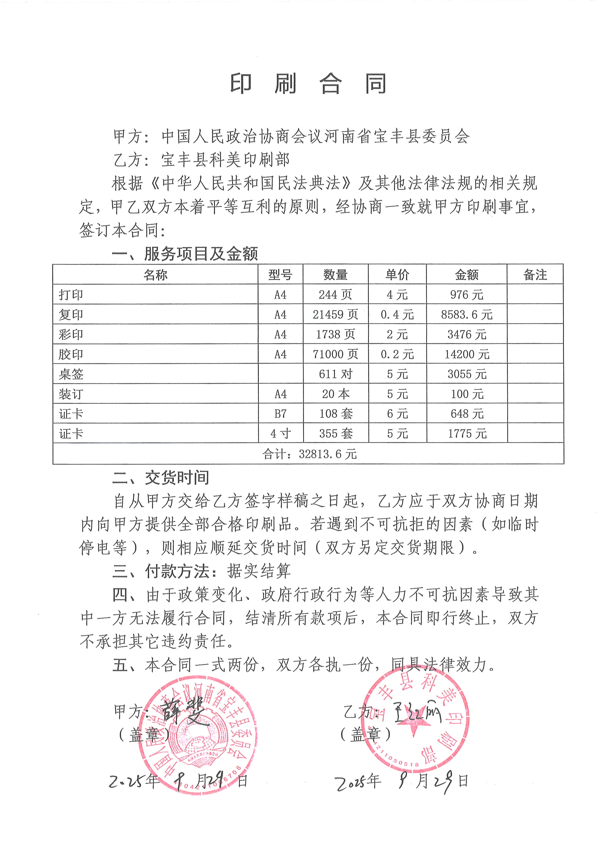 | *.供应商(乙方):宝丰县科美印刷部 | ||||||||||||