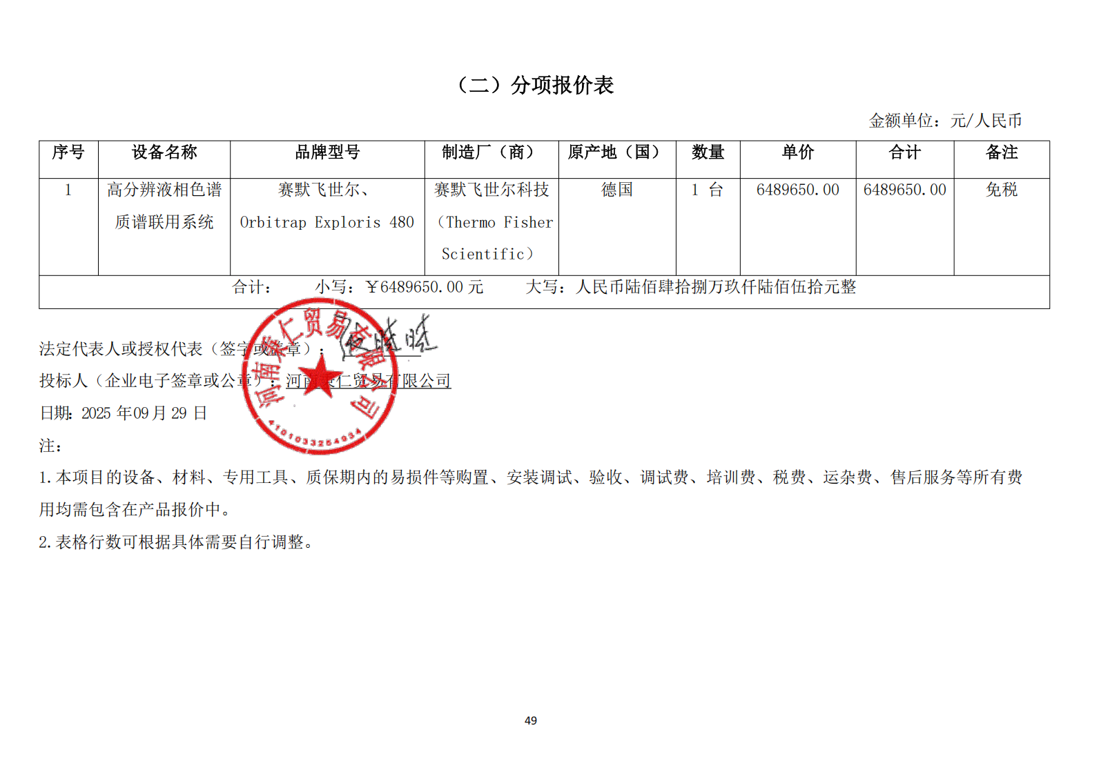 | *.*采购内容:河南农业大学先进农业技术开放创新平台建设项目设备采购十一期项目二次,高分辨液相色谱质谱联用系统*台(可投进口),包含设备的供货、运输、保险、装卸、安装、检测、调试、试运行、验收交付、培训、技术支持、软件升级、售后保修、移机服务、质保期内外服务及相关伴随服务等。 *.*标包划分:本项目共分为*个标包 *.*交货期:自接采购人供货通知之日起,进口设备***天内完成供货、安装、调试,国产设备**天内完成供货、安装、调试。 *.*质量要求:合格,符合国家及行业相关标准及要求,并满足采购人的相关要求。 *.*质保期:*年整机质保,质保期自验收签字之日起计算。 *.*交货地点:河南农业大学龙子湖校区。 | |||||||||||||||||||||||||||||||