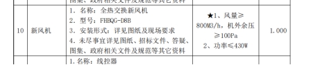 招标文件中货物需求一览表中新风机个数为一个,而在图纸中显示新风机个数为两个,且二者参数不一致: