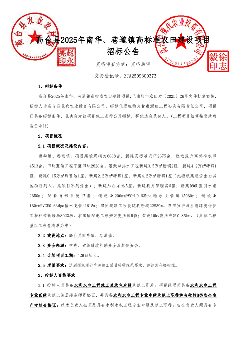 高台县2025年南华、巷道镇高标准农田建设项目招标公告