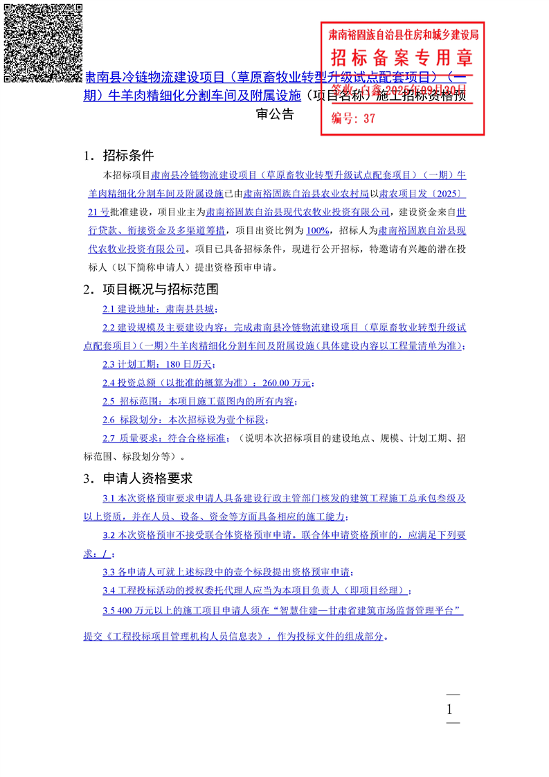 肃南县冷链物流建设项目(草原畜牧业转型升级试点配套项目)(一期)牛羊肉精细化分割车间及附属设施