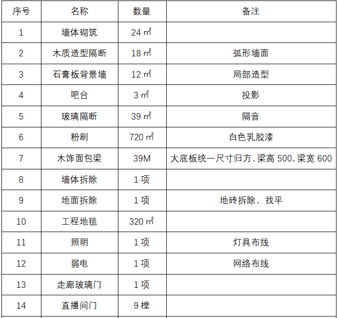 *.项目内容:艺术设计学院*号实训楼*楼直播间装修工程*.具体工程量明细: