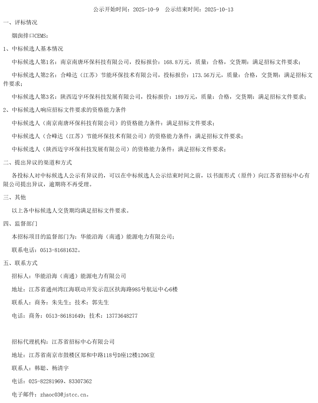 华能南通(通州湾)2×100万千瓦大型清洁高效煤电项目烟囱排口CEMS中标候选人公示(JSTCC2500315667)