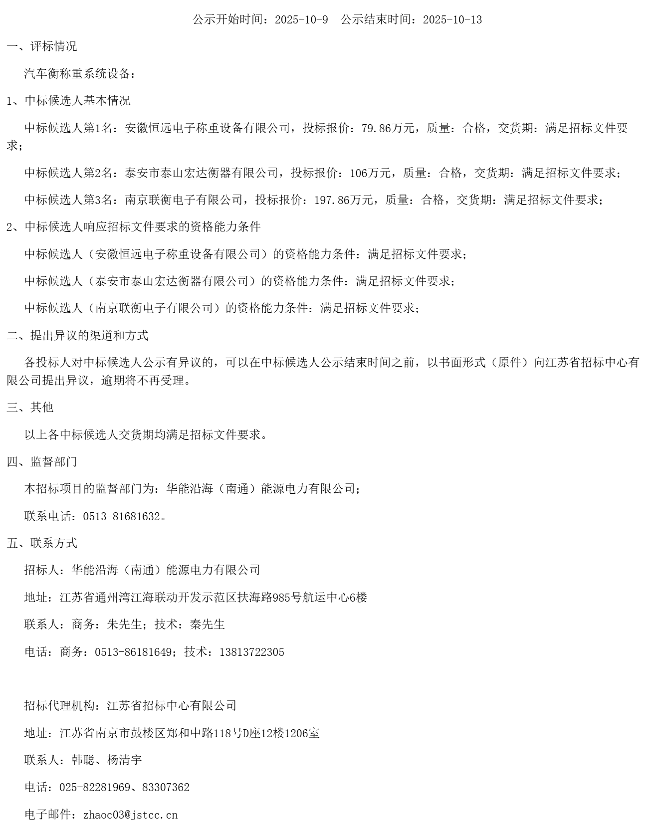 华能南通(通州湾)2×100万千瓦大型清洁高效煤电项目汽车衡称重系统设备中标候选人公示(JSTCC2500315666)