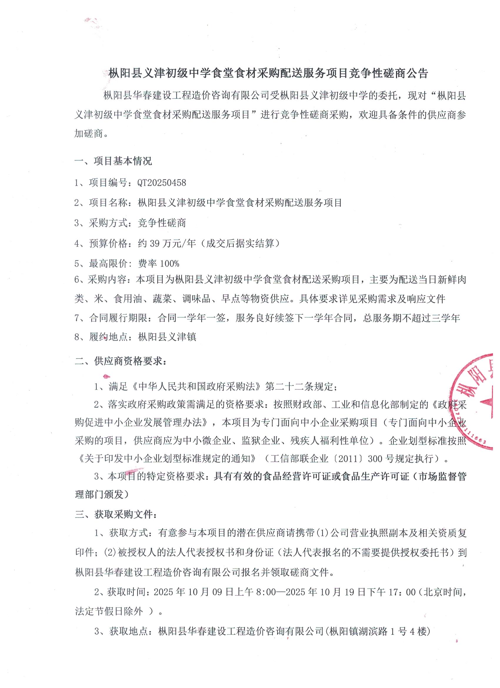 枞阳县华春建设工程造价咨询有限公司受枞阳县义津初级中学的委托,现对“枞阳县义津初级中学食堂食材采购配送服务项目”进行竞争性磋商采购,欢迎具备条件的供应商参加磋商。