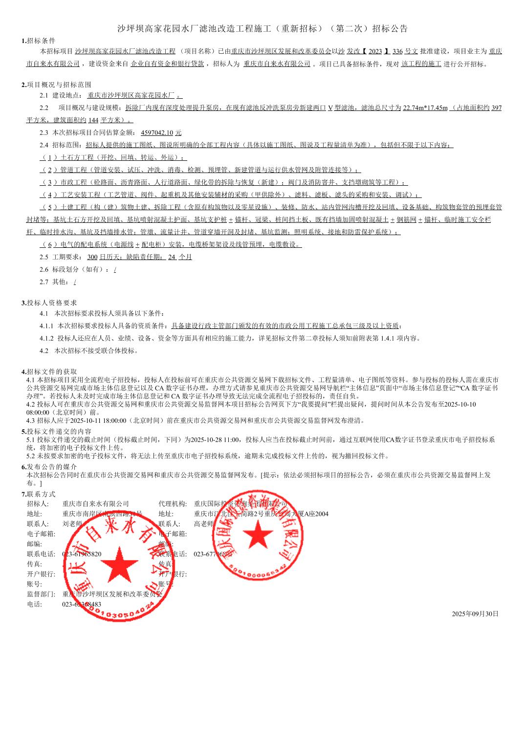 沙坪坝高家花园水厂滤池改造工程施工(重新招标)(第二次)招标公告