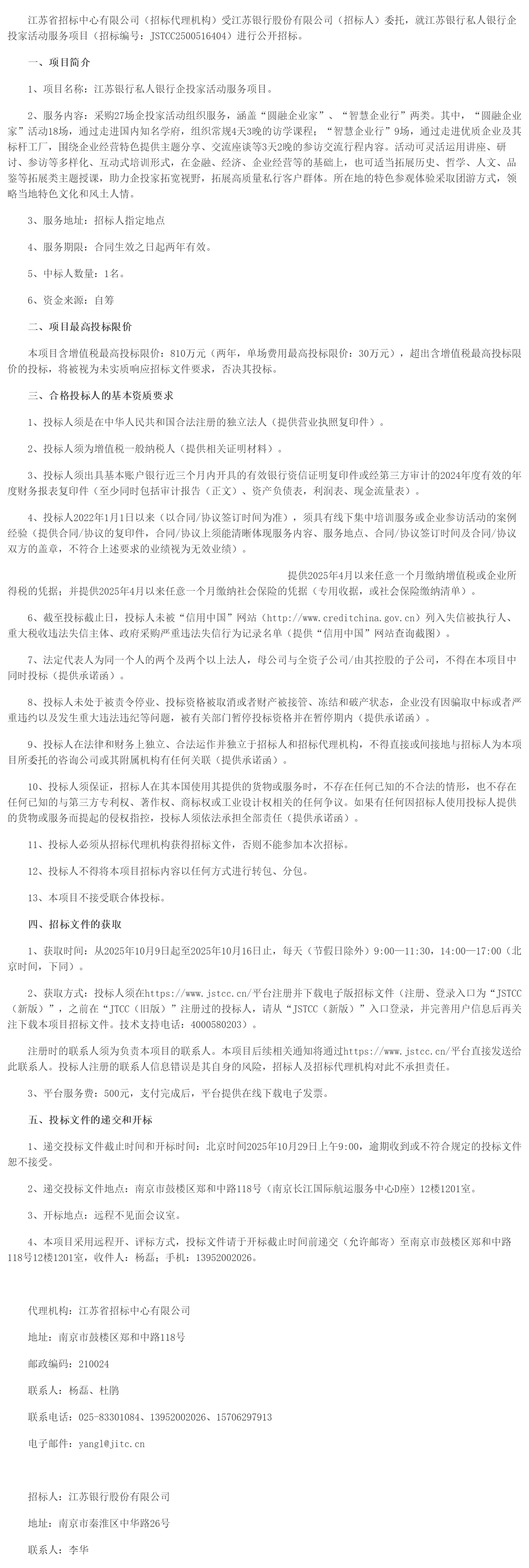 江苏省招标中心有限公司(招标代理机构)受江苏银行股份有限公司(招标人)委托,就江苏银行私人银行企投家活动服务项目(招标编号:***************)进行公开招标。