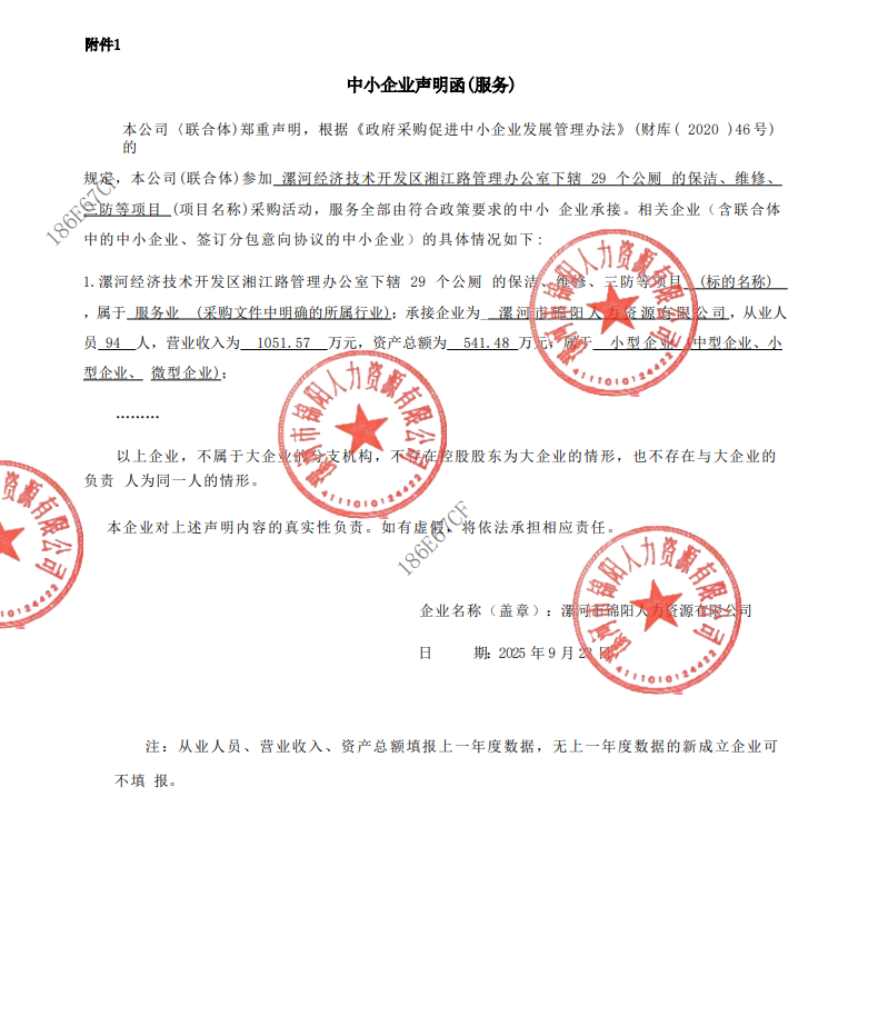 | *、采购项目名称:漯河经济技术开发区湘江路管理办公室下辖**个公厕的保洁、维修、三防等项目 | |||||||||||||||||||||||||||||||