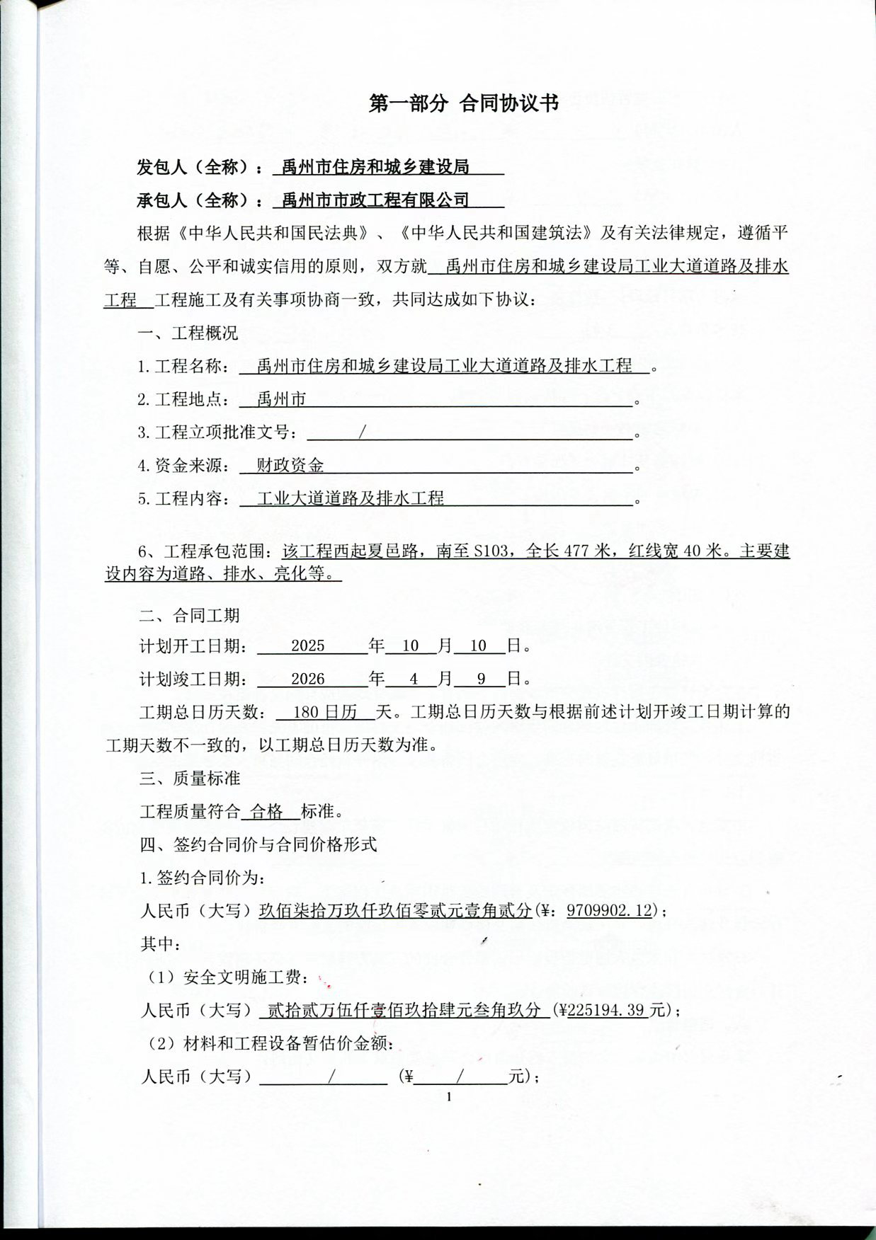 | 二、合同名称:禹州市住房和城乡建设局工业大道道路及排水工程项目 | ||||||||||||