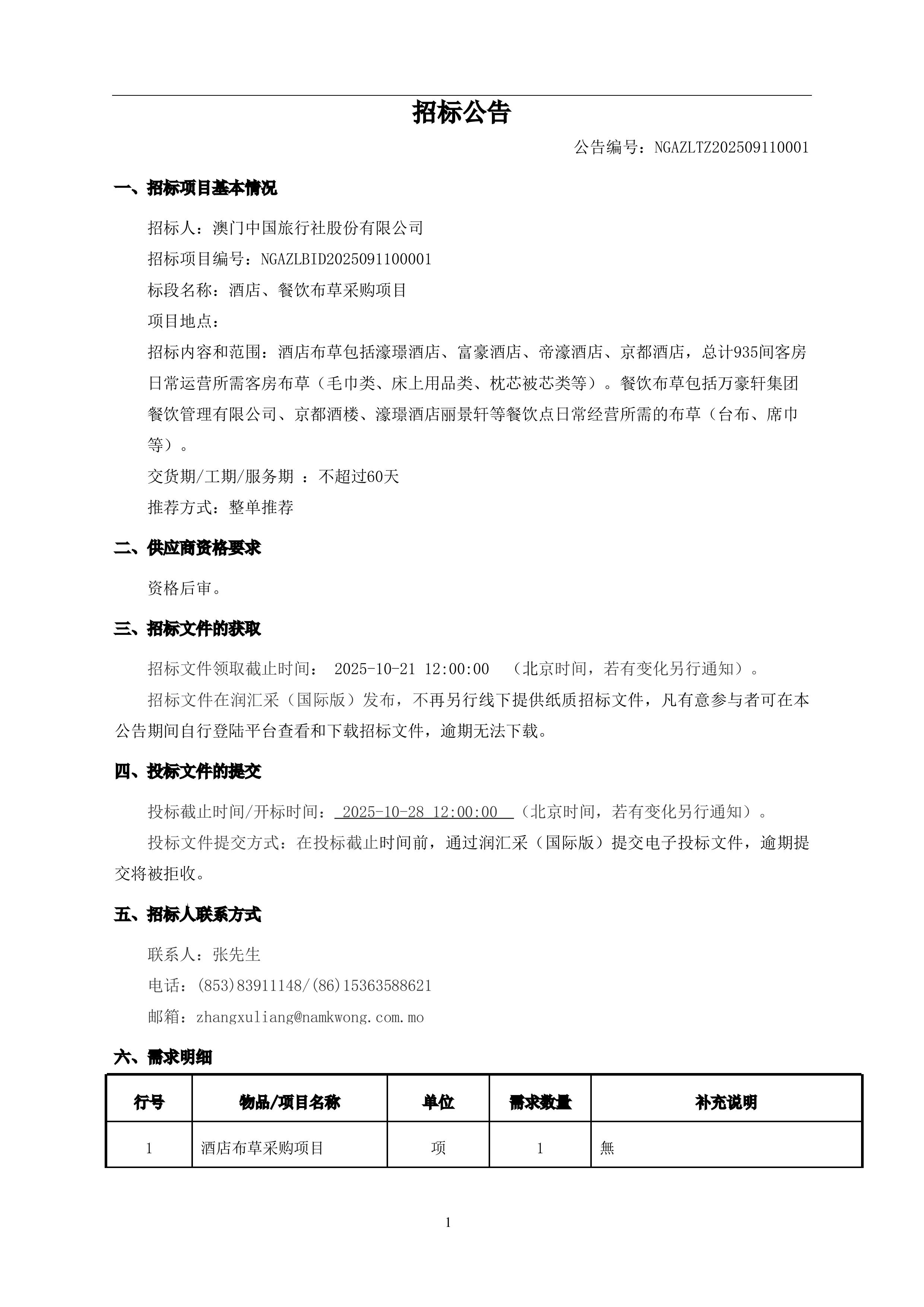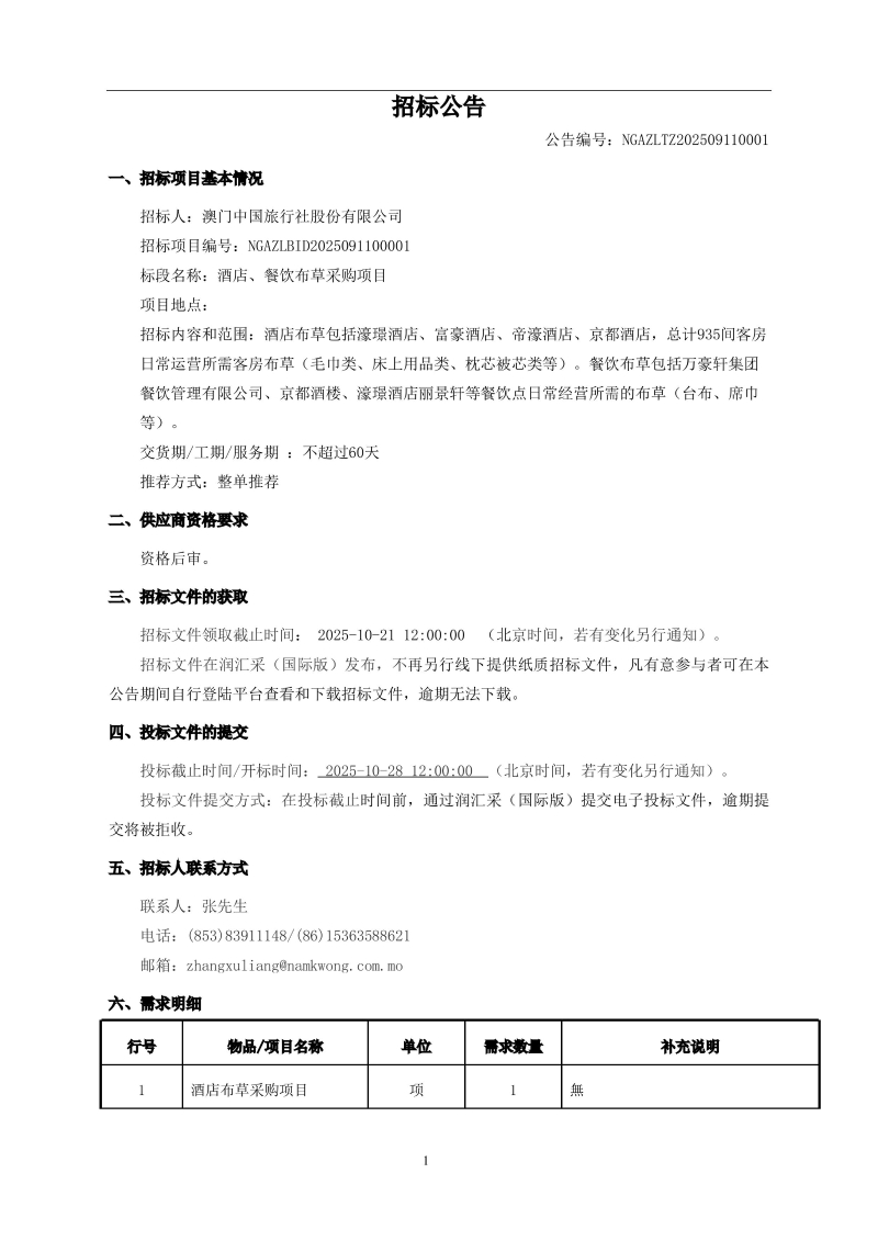 澳门中国旅行社股份有限公司酒店、餐饮布草采购项目公告