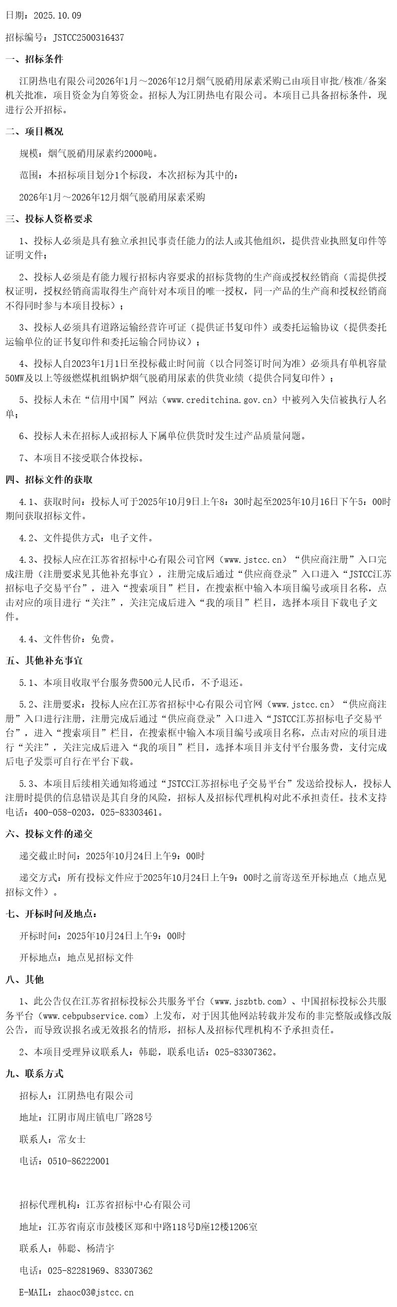 江阴热电有限公司****年*月~****年**月烟气脱硝用尿素采购招标公告(*************** )