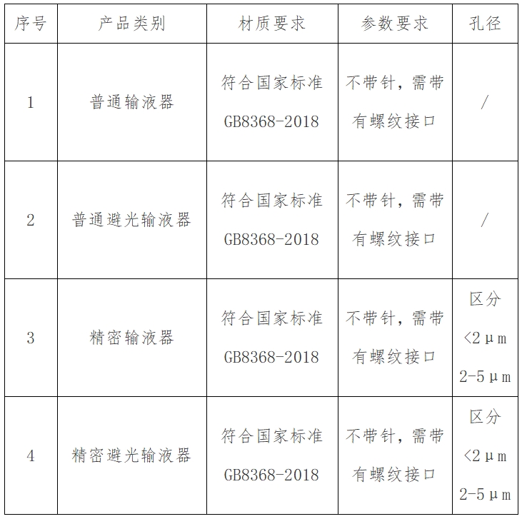 *.*、调研列表范围:填报产品应为已获得国内有效注册证的“输液器”类医用耗材(一次性使用吊瓶式和袋式输液器、一次性使用滴定管式输液器、一次性使用压力输液器等专用输液器或特殊性能输液器不在本次调研范围内)。国家医保医用耗材分类与代码段(包括但不限于):***************,详见下表: