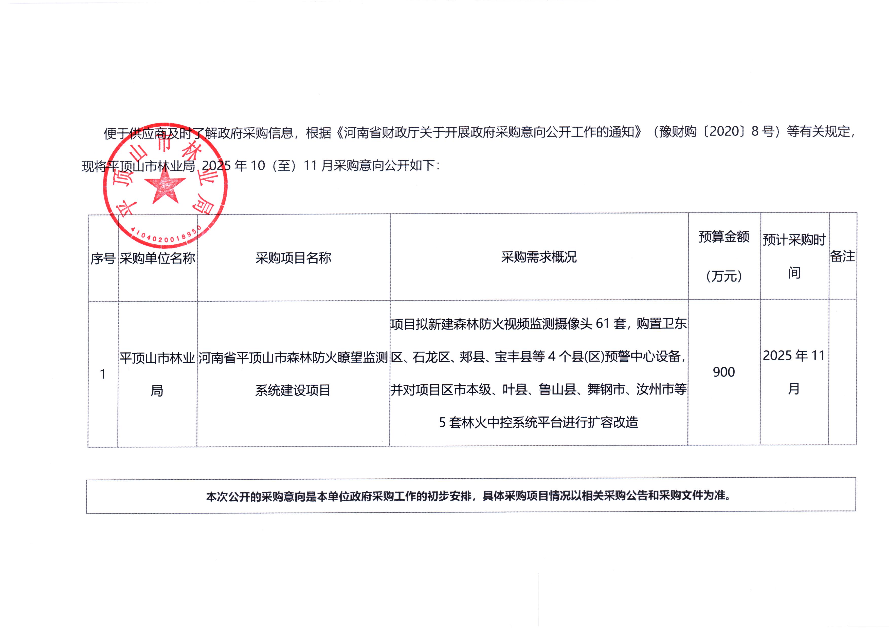 为便于供应商及时了解政府采购信息,根据《河南省财政厅关于开展政府采购意向公开工作的通知》(豫财购〔****〕*号)等有关规定,现将平顶山市林业局 ****年**(至)**月采购意向公开如下: |