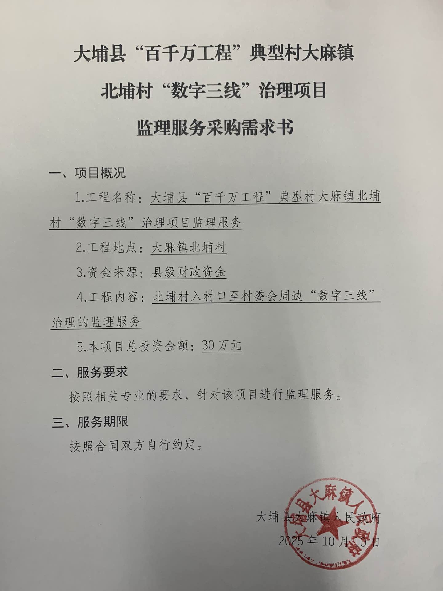 大埔县“百千万工程”典型村大麻镇北埔村“数字三线”治理项目监理服务采购公告