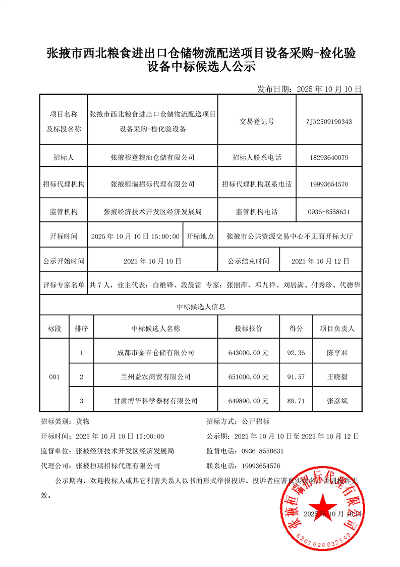 [市本级]张掖市西北粮食进出口仓储物流配送项目设备采购-检化验设备中标候选人公示交易结果公示