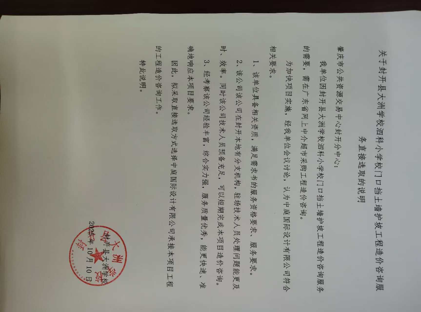 封开县大洲学校泗科小学校门口挡土墙护坡工程造价咨询服务中选公示
