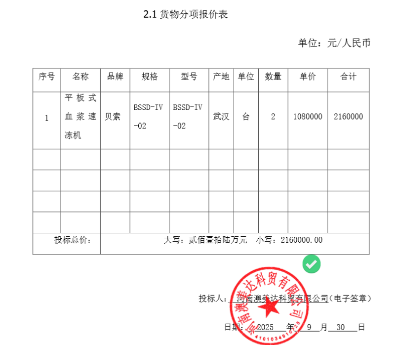 河南省红十字血液中心血浆速冻机项目-中标公告