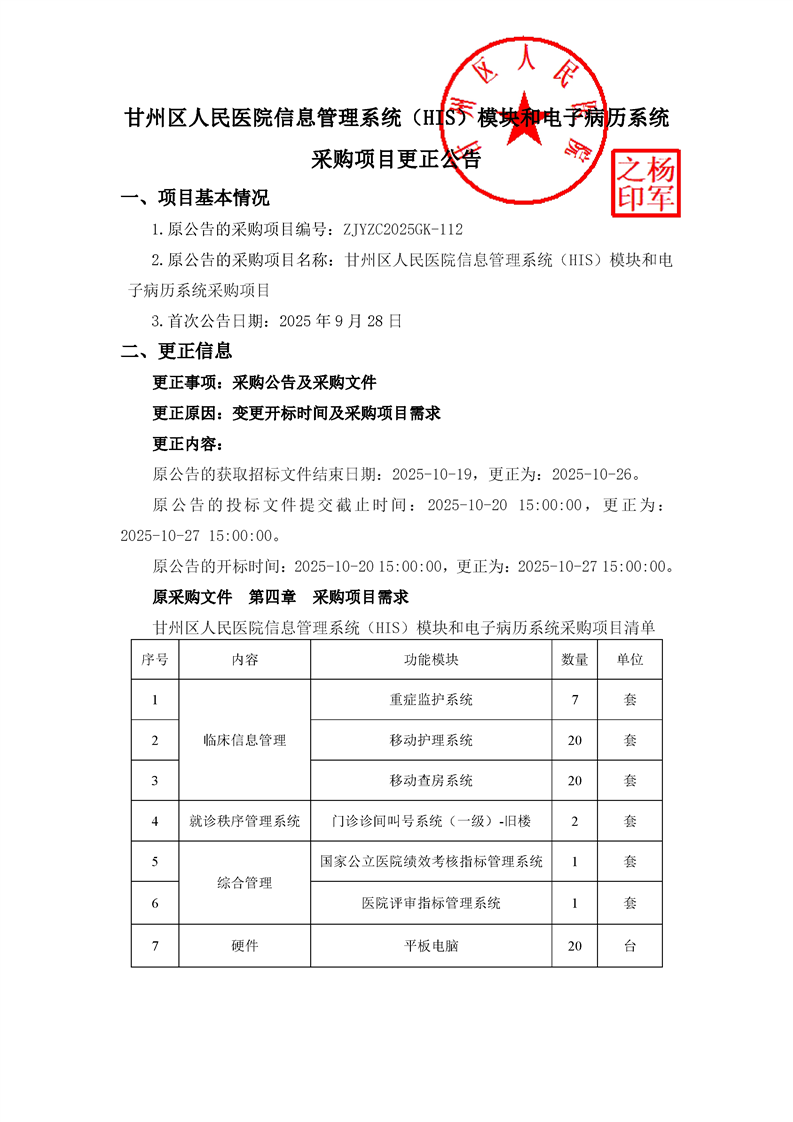甘州区人民医院信息管理系统(HIS)模块和电子病历系统采购项目更正公告