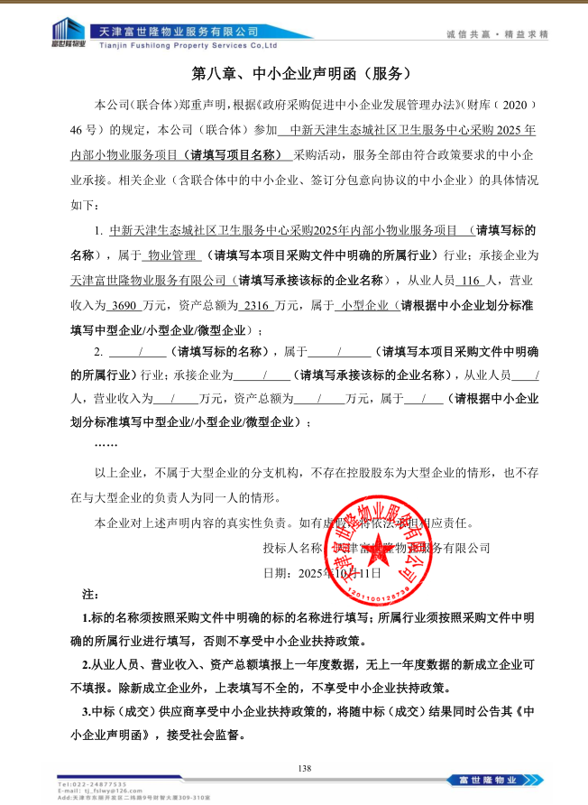 中新天津生态城社区卫生服务中心采购2025年内部小物业服务项目(项目...