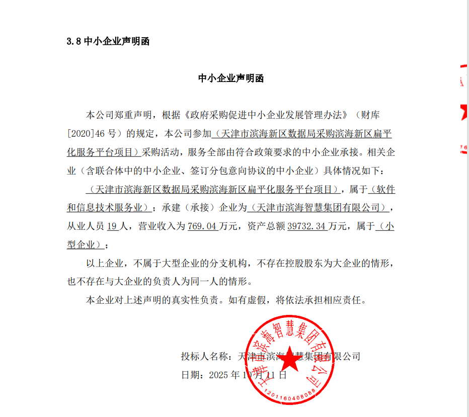 受天津市滨海新区数据局委托,天津市滨海新区政府采购中心以公开招标方式,对天津市滨海新区数据局采购滨海新区扁平化服务平台项目实施采购,现将中标结果公布如下: 一、项目名称和编号 *.项目名称:天津市滨海新区数据局采购滨海新区扁平化服务平台项目 *.项目编号:**************** 二、中标信息 第*包:扁平化服务平台采购 *.中标供应商名称:天津市滨海智慧集团有限公司 *.中标供应商地址:天津市滨海新区中新天津生态城动漫中路***号创展大厦第*座*层***、***单元 *.供应商评审报价、评审总得分及排序情况:见附件 *.主要中标标的名称、规格型号、数量、单价、服务要求或者标的基本概况:见附件 三、评标委员会成员名单 张绍华、李琪、何媛、魏津瑜、杨连群(采购人代表) 四、项目联系人及联系方式 *.联系人:夏冰 *.联系方式:************ 五、采购人的名称、地址和联系方式 *.采购人名称:天津市滨海新区数据局 *.采购人地址:滨海新区大连东道****号 *.采购人联系电话:张海蛟 **** ******** 六、采购代理机构的名称、地址和联系方式 *.采购代理机构名称:天津市滨海新区政府采购中心 *.采购代理机构地址:天津市滨海新区营口道***号 *.采购代理机构联系方式:************ 七、质疑方式 参与本项目政府采购活动的供应商认为中标结果使自己的合法权益受到损害的,可以在中标结果公告期限届满之日起*个工作日内,以书面形式向采购人和天津市滨海新区政府采购中心提出质疑,逾期不予受理。 八、本项目不向中标供应商收取服务费。 九、中标结果公告期限 中标结果的公告期限为*个工作日。 十、招标文件公告:见附件