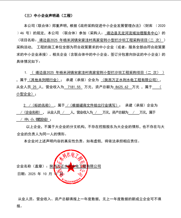 靖边县2025年杨米涧镇宋家洼村高家窑则小型拦沙坝工程采购项目(二次)中标(成交)结果公告