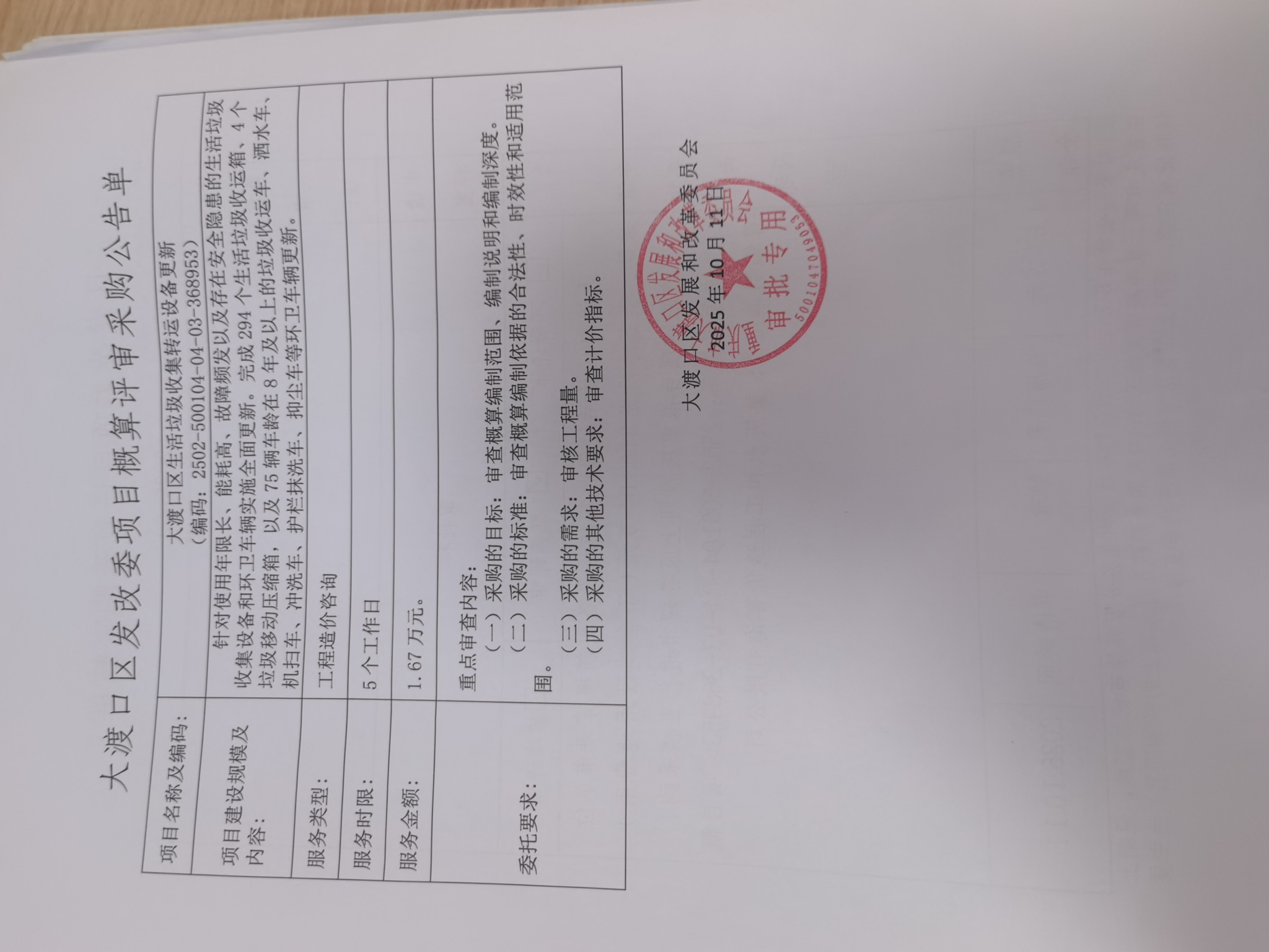 项目名称 | 大渡口区生活垃圾收集转运设备更新概算评审 |