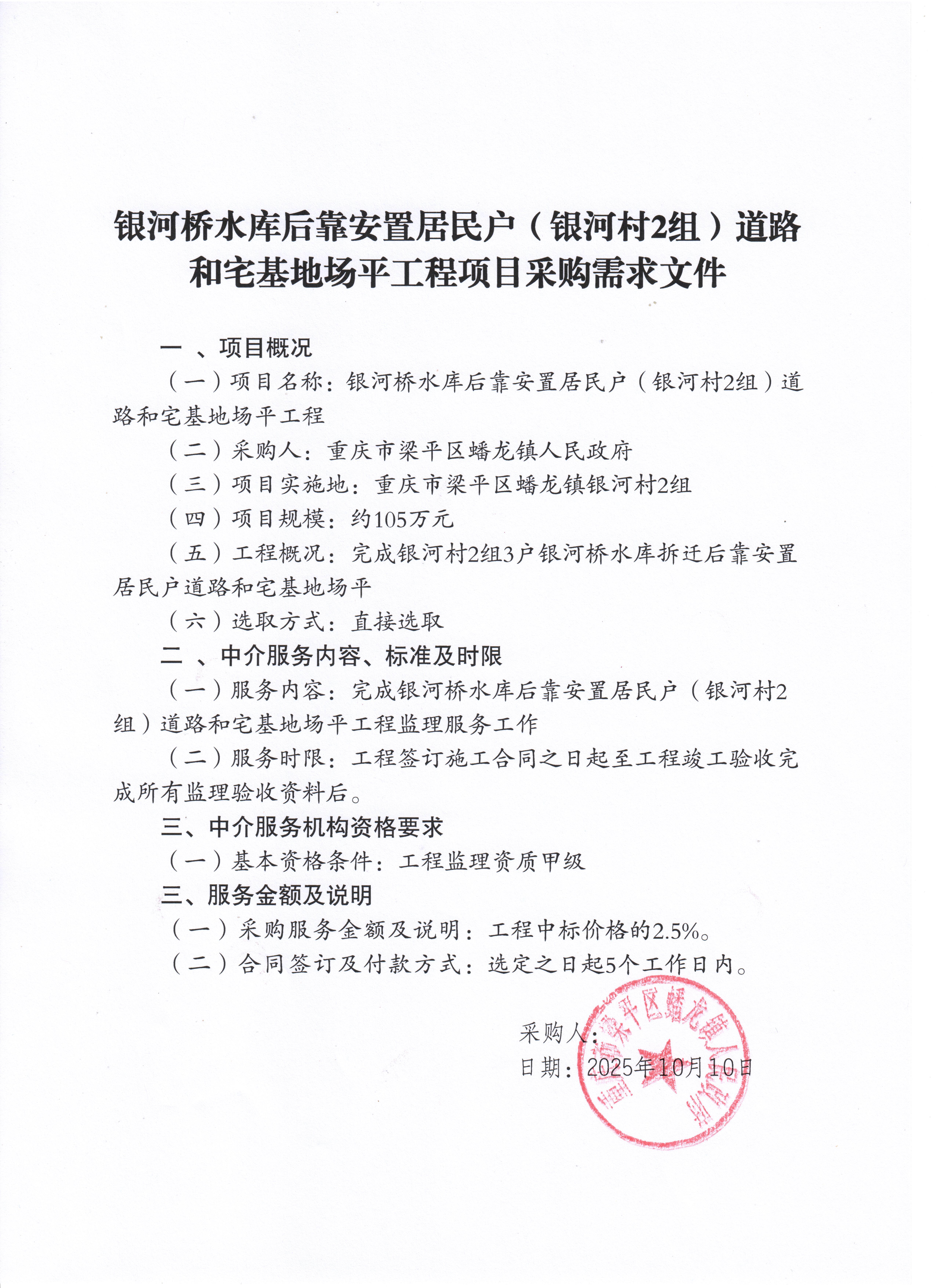 【梁平区】 关于为【银河桥水库后靠安置居民户(银河村2组)道路和宅基地场平工程】 公开选取【工程监理】机构的公告