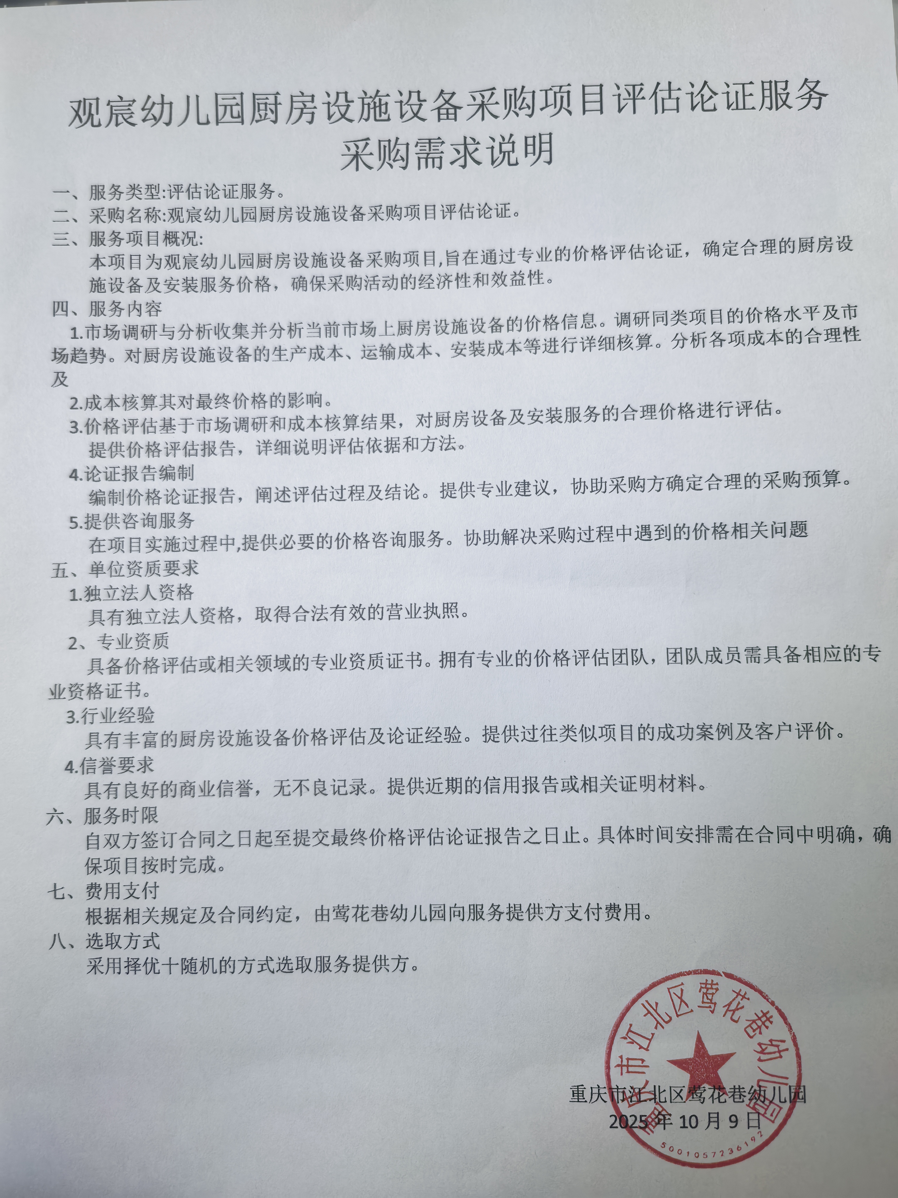 【江北区】 关于为【观宸幼儿园厨房设施设备采购项目评估论证服务】 公开选取【工程造价咨询】机构的公告