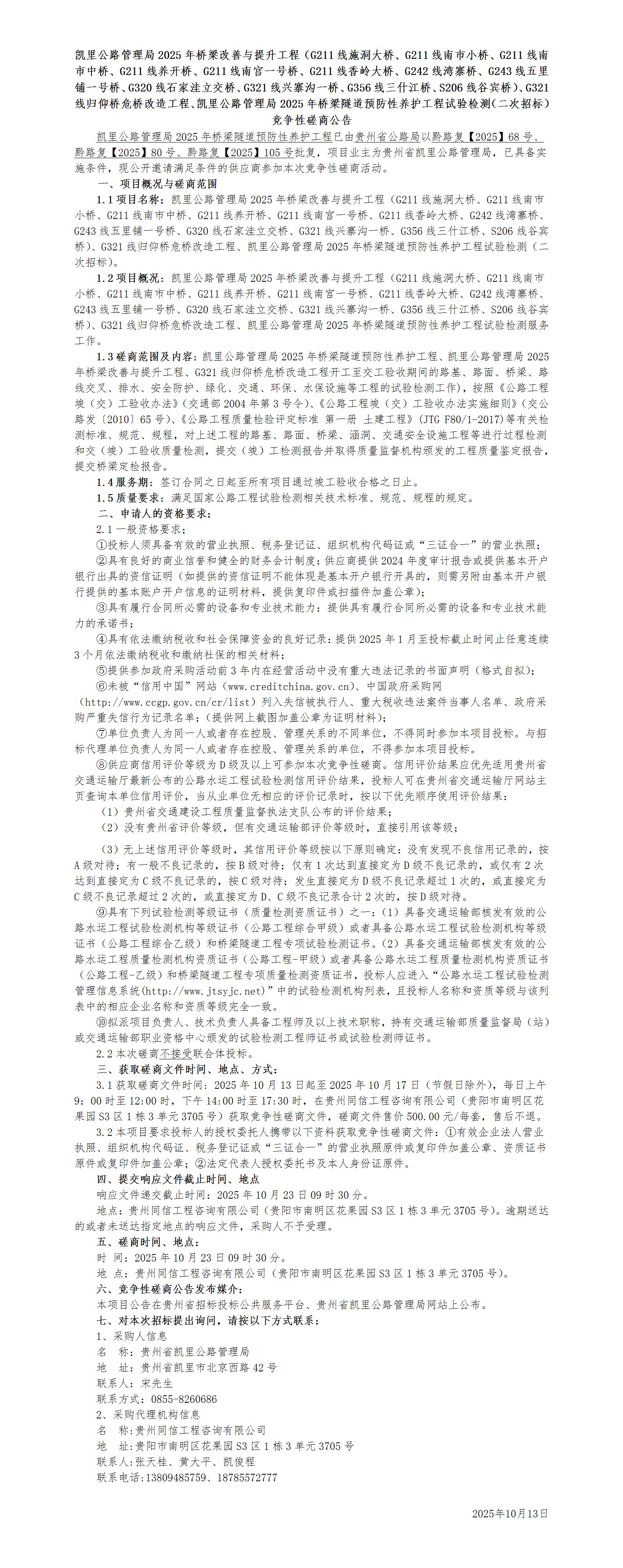凯里公路管理局2025年桥梁改善与提升工程、G321线归仰桥危桥改造工程、凯里公路管理局2025年桥梁隧道预防性养护工程试验检测(二次招标)竞争性磋商公告