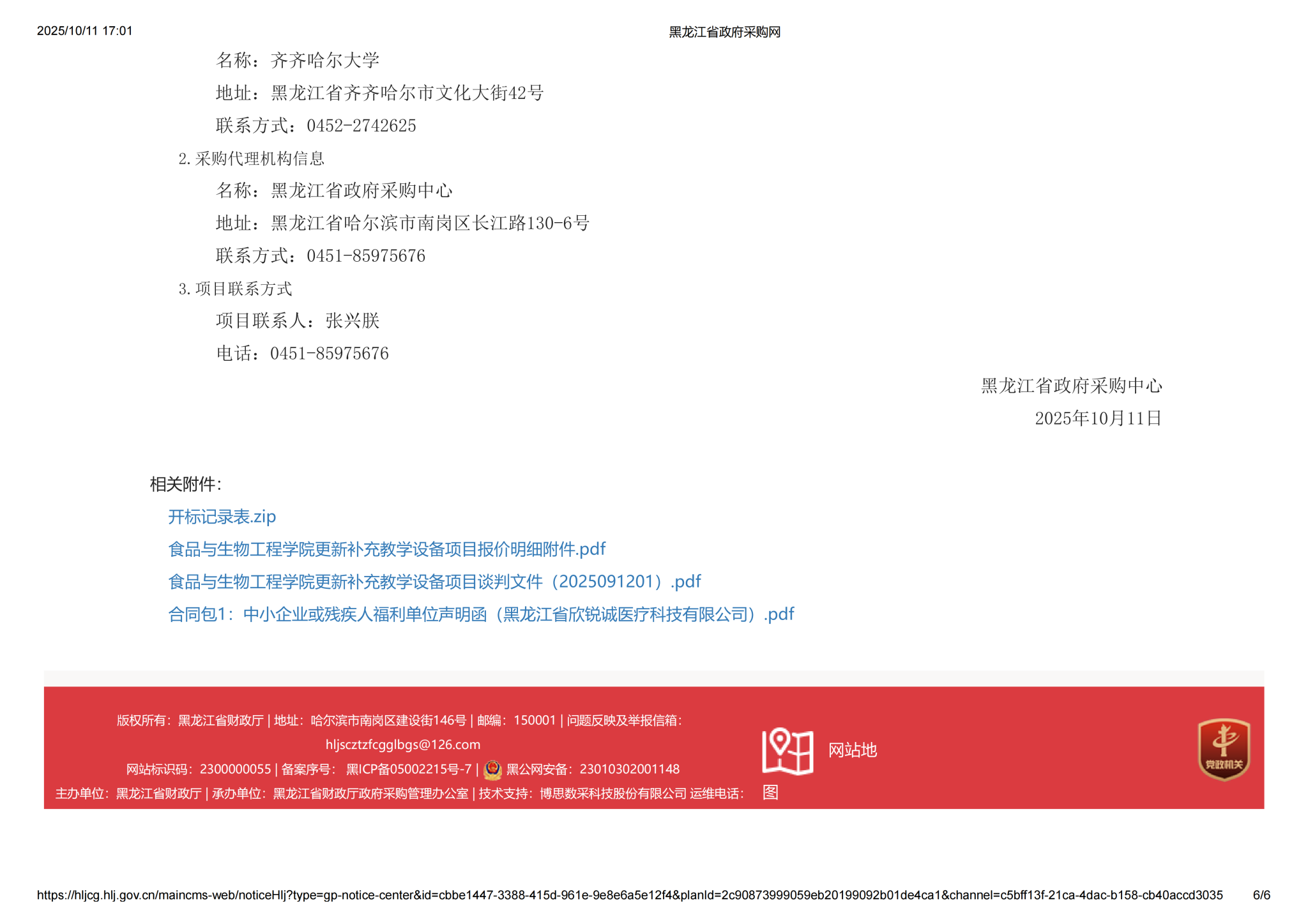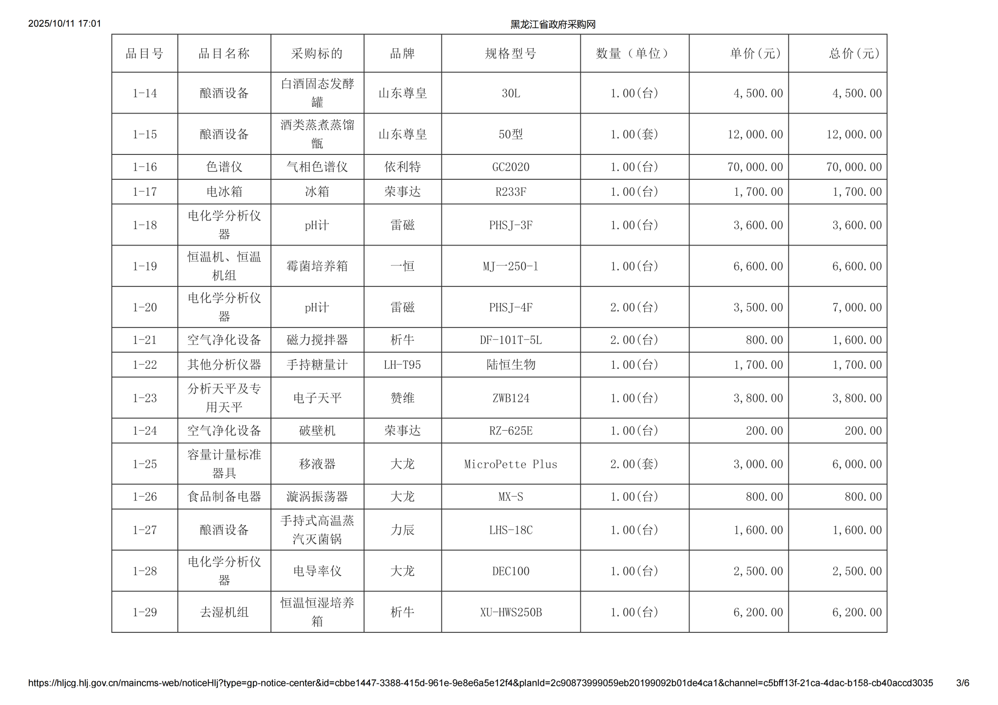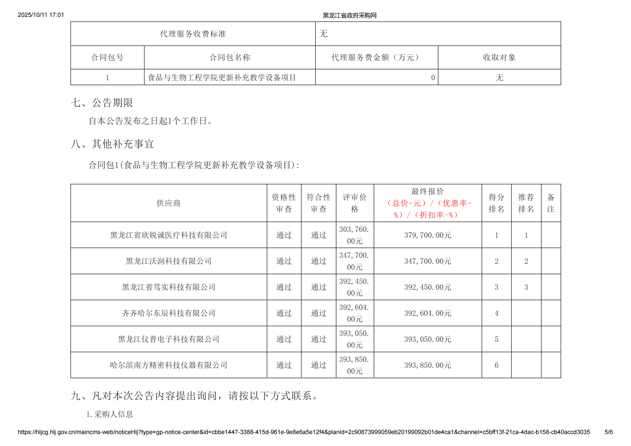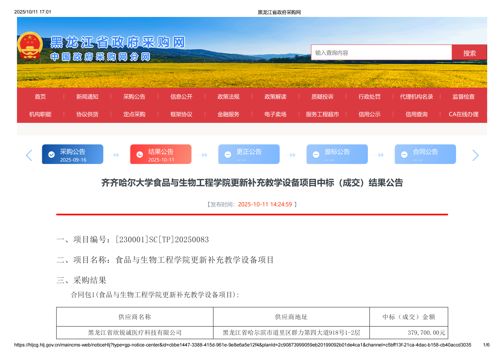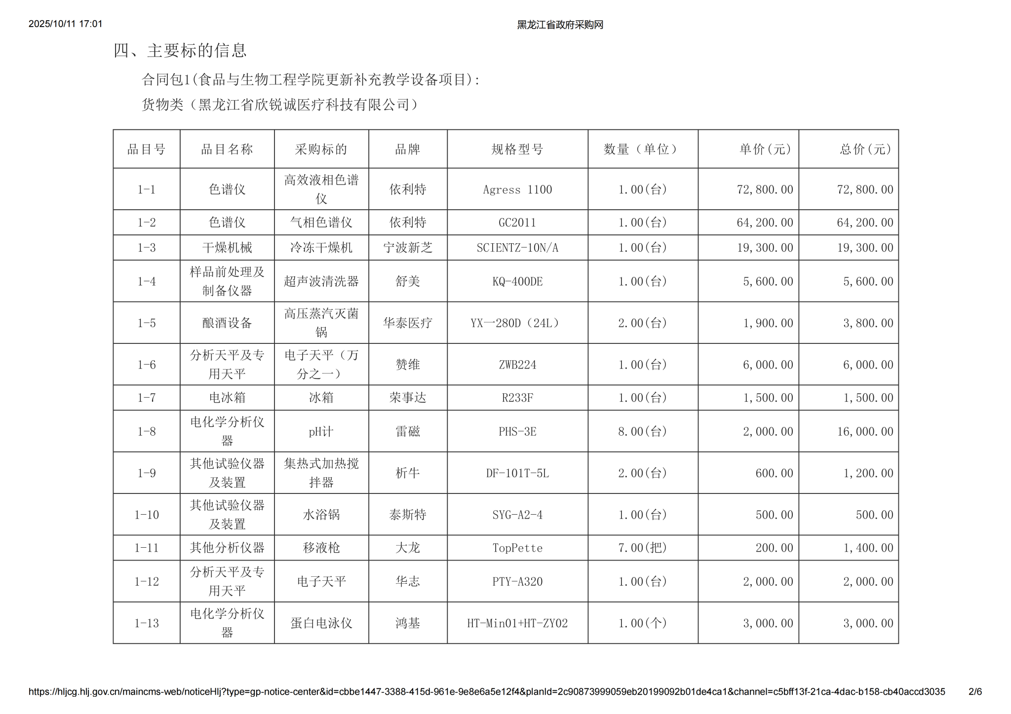 齐齐哈尔大学食品与生物工程学院更新补充教学设备项目中标(成交)结果公告(转自黑龙江省政府采购网)