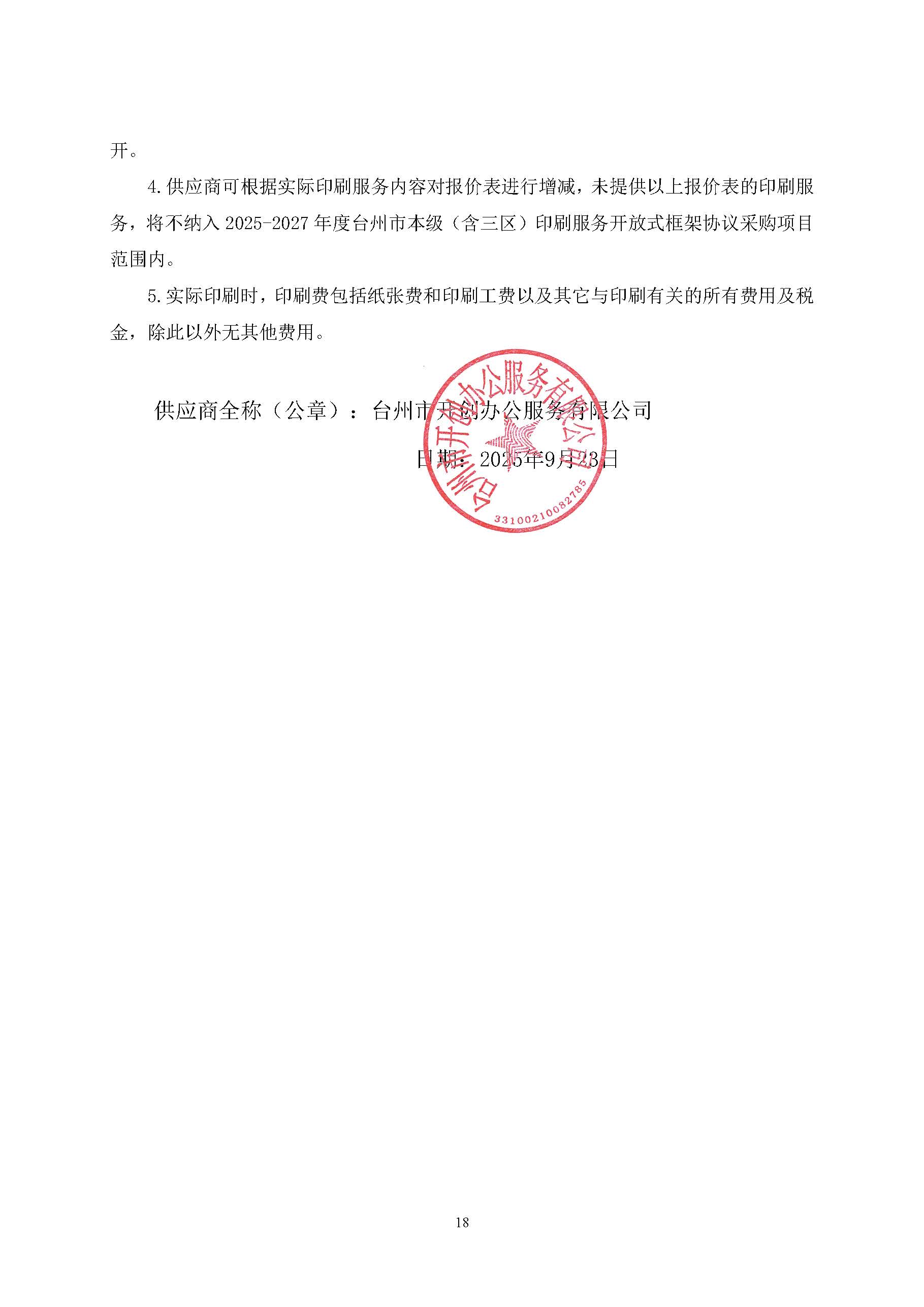 台州市开创办公服务有限公司入围2025-2027年度台州市本级(含三区)印刷服务开放式框架协议采购项目的结果公告