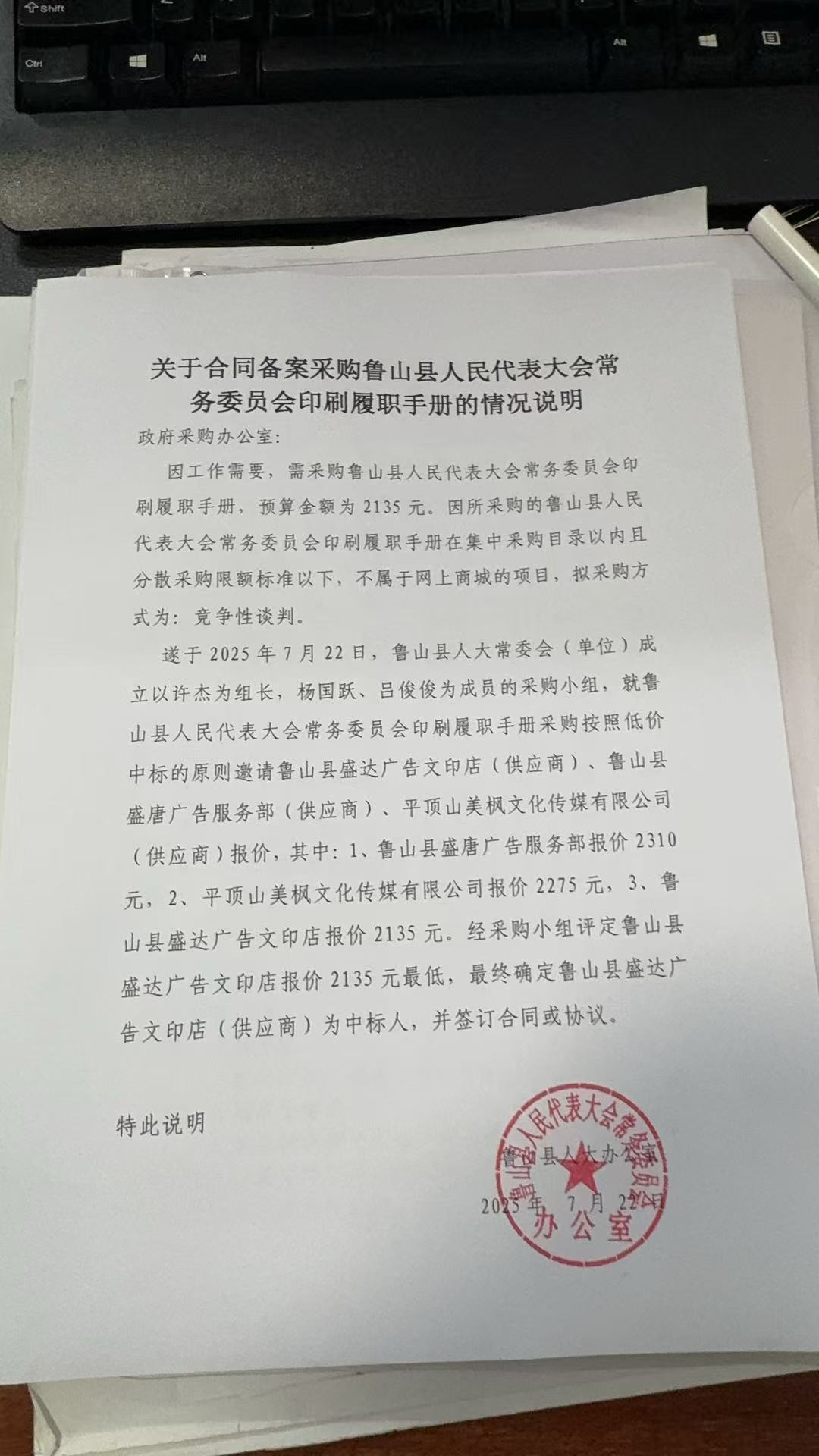 | 二、合同名称:鲁山县人民代表大会常务委员会印刷履职手册 | ||||||||||||
