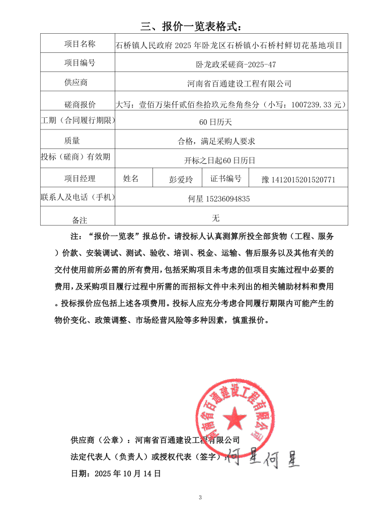 | *、采购项目名称:石桥镇人民政府****年卧龙区石桥镇小石桥村鲜切花基地项目 | |||||||||||||||||||||||||||||||