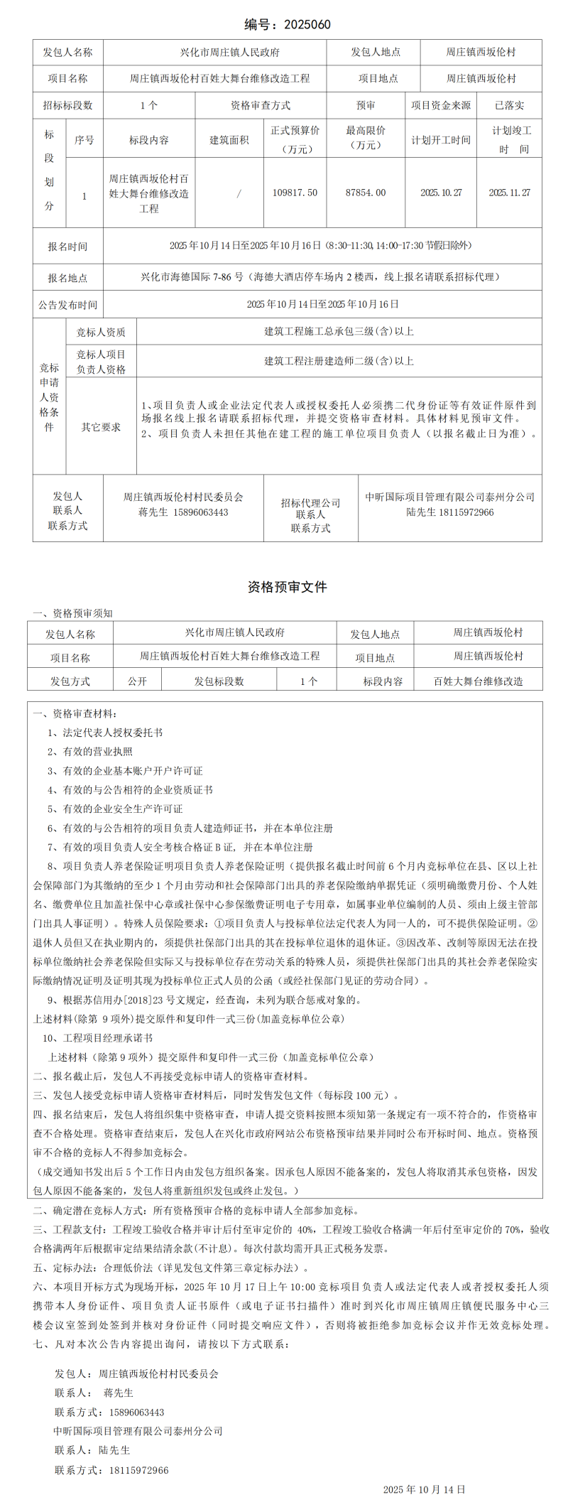 周庄镇西坂伦村百姓大舞台维修改造工程发包公告