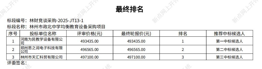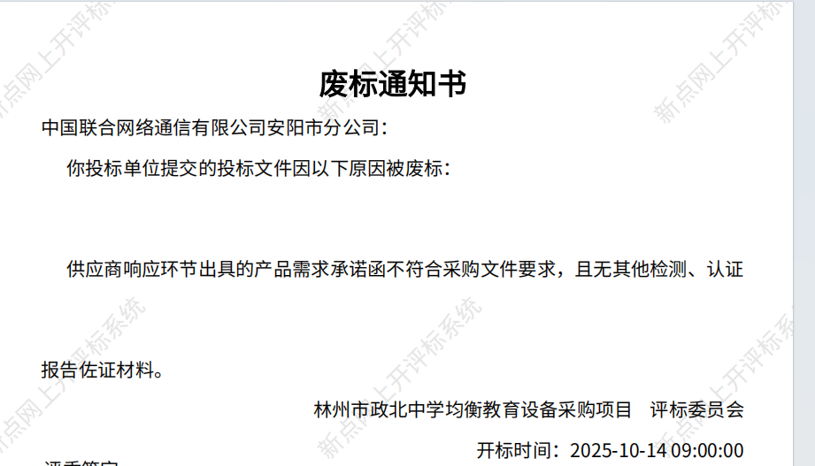 | 第一成交候选人:河南为民教学设备有限公司,最终报价******元;第二成交候选人:郑州思之润电子科技有限公司,最终报价******元;第三成交候选人:林州市天汇科贸有限公司,最终报价******元。中国联合网络通信有限公司安阳市分公司经谈判小组评审“供应商响应环节出具的产品需求承诺函不符合采购文件要求,且无其他检测、认证报告佐证材料。”予以废标。 各有关当事人对中标结果有异议的,可以在中标公告期限届满之日起七个工作日内,以书面形式同时向采购人和采购代理机构提出质疑(加盖单位公章且法人签字),依据法规规定,质疑函应当有明确的请求和必要的证明材料。以质疑函接受确认日期作为受理时间,逾期提交或未按照要求提交的质疑函将不予受理。 | |||||||||||||||||||||||||||||||