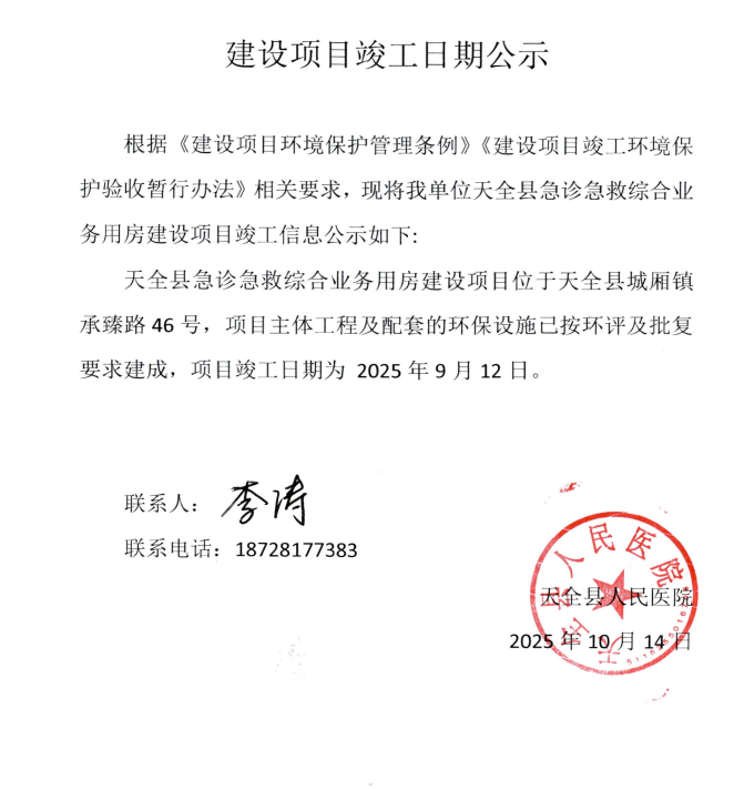 天全县人民医院急诊急救综合业务用房建设项目竣工日期公示