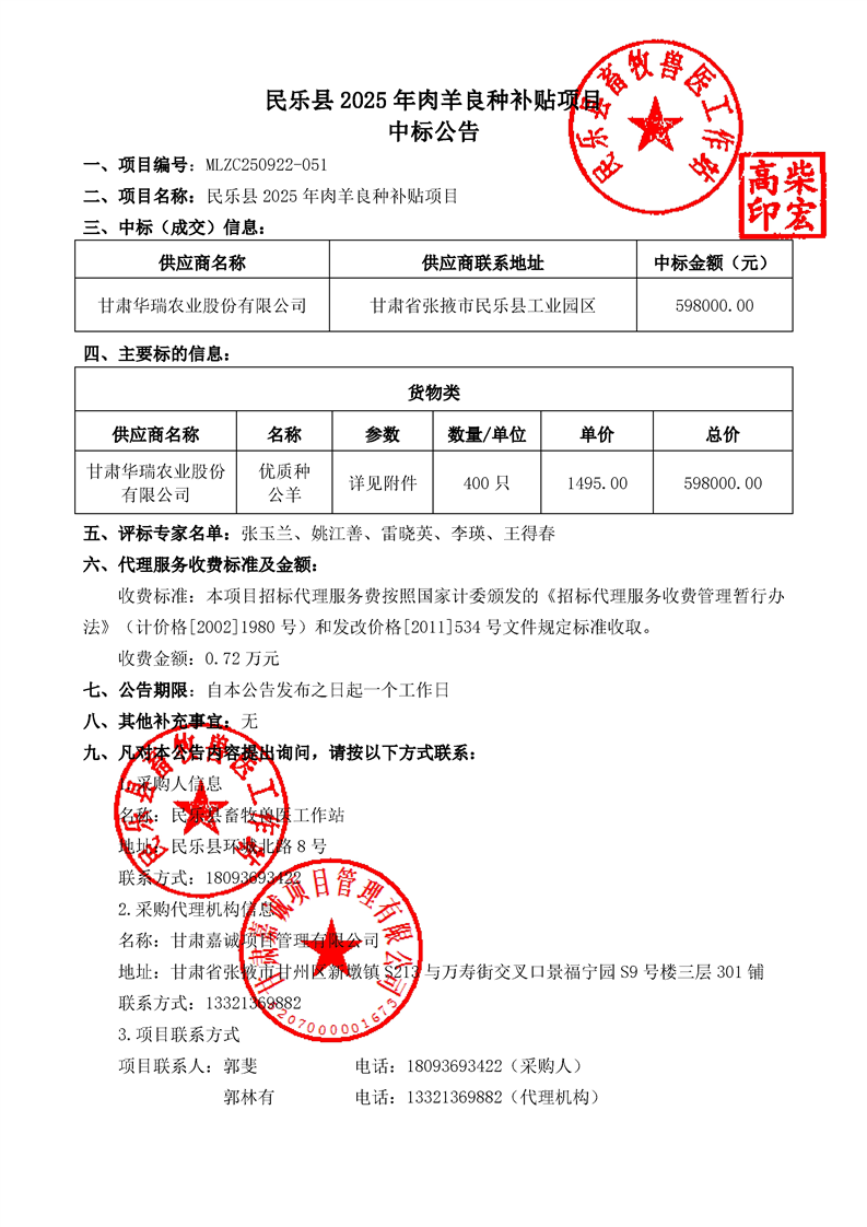 民乐县2025年肉羊良种补贴项目中标公示{type}