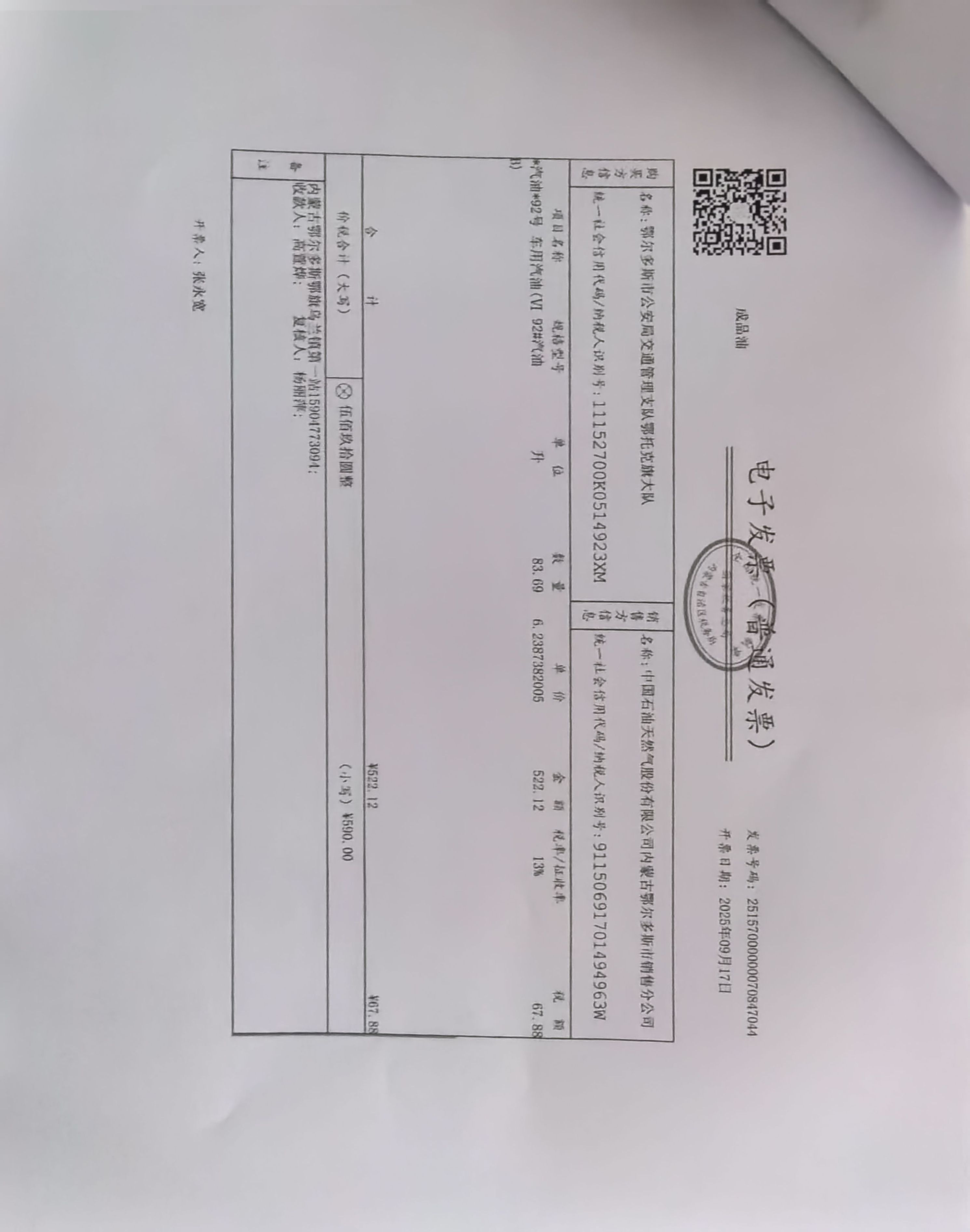 一、合同编号:*************二、合同名称:鄂旗交管大队车辆燃油费三、项目编号:鄂财购备字(电子)[****]*****号四、项目名称:车辆燃油费五、合同主体采购人(甲方):鄂尔多斯市公安局交通管理支队鄂托克旗大队 地址:鄂托克旗乌兰镇 联系方式:*********** 供应商(乙方):中国石油天然气股份有限公司内蒙古销售分公司 地址:内蒙古自治区呼和浩特市新城区成吉思汗大街 联系方式:************ 六、合同主要信息主要标的: