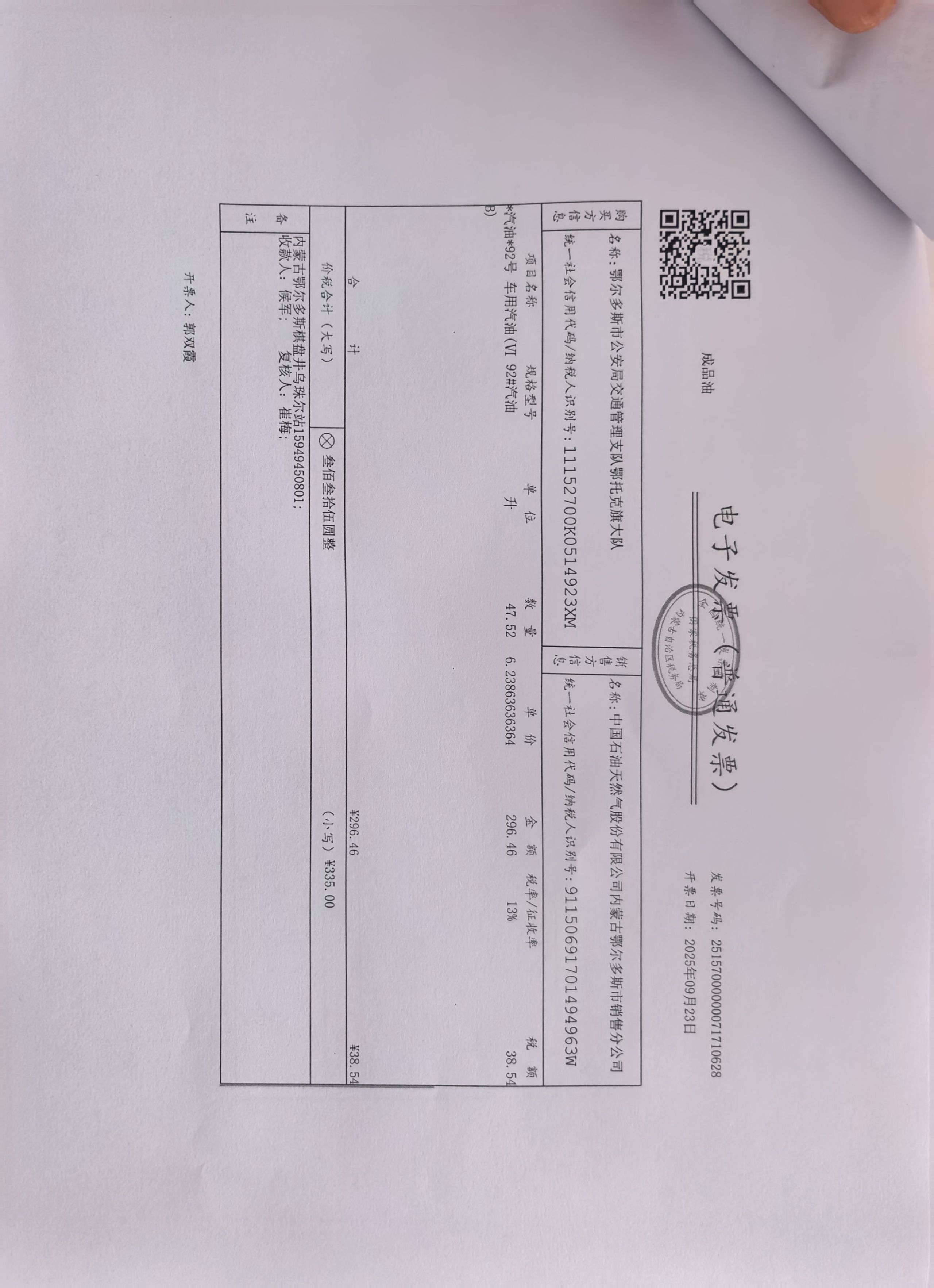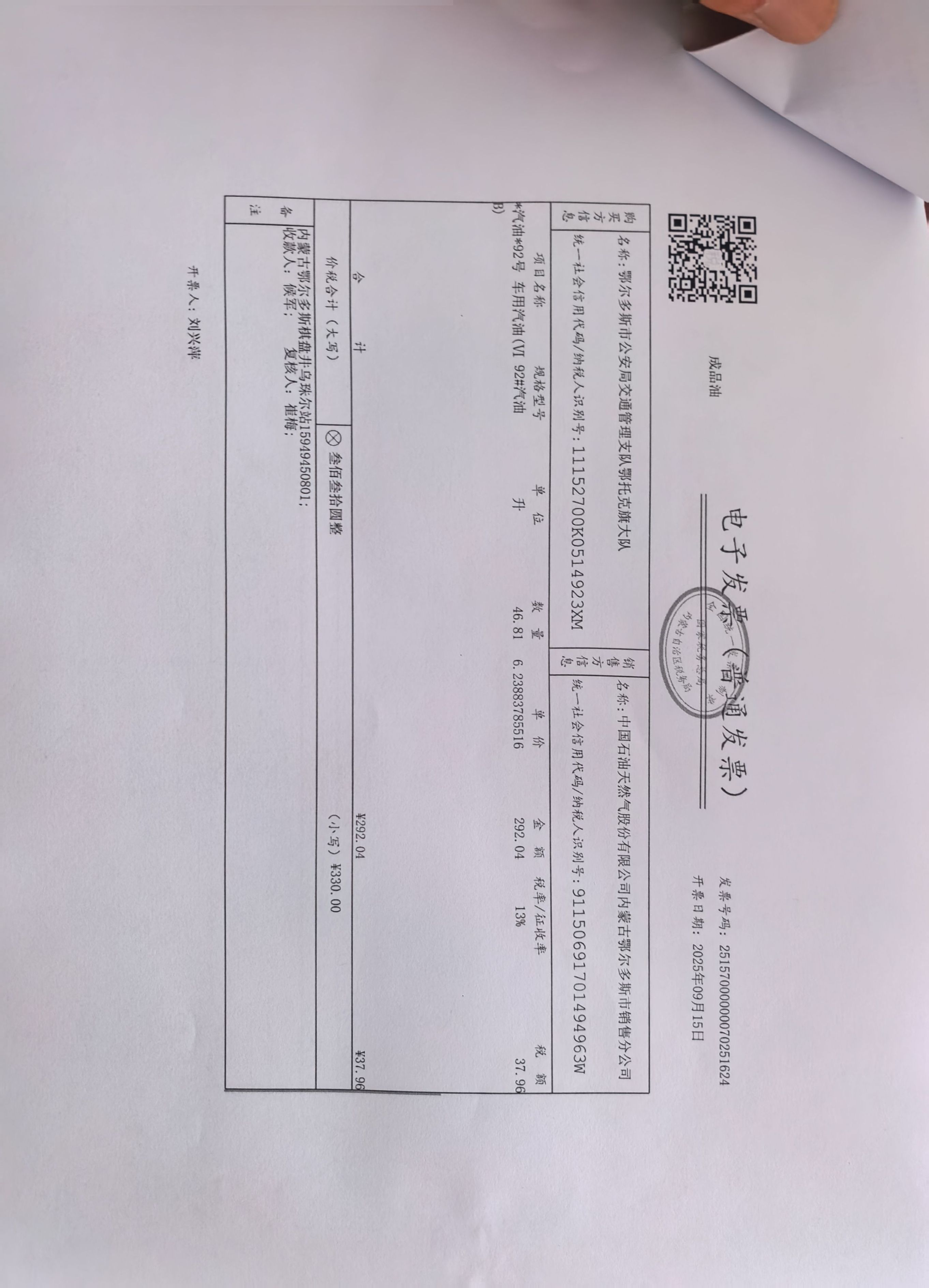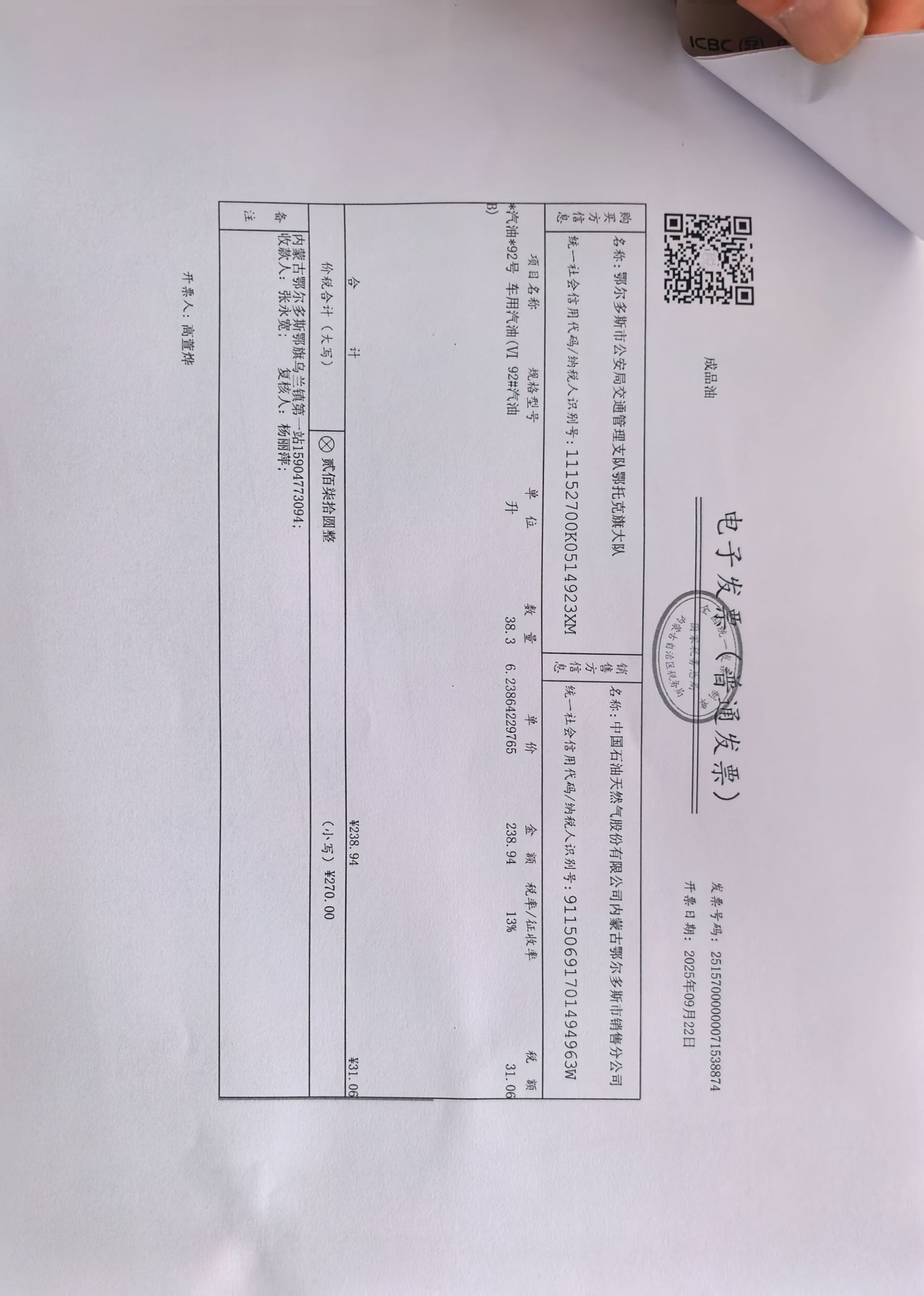 一、合同编号:*************二、合同名称:鄂旗交管大队车辆燃油费三、项目编号:鄂财购备字(电子)[****]*****号四、项目名称:车辆燃油费五、合同主体采购人(甲方):鄂尔多斯市公安局交通管理支队鄂托克旗大队 地址:鄂托克旗乌兰镇 联系方式:*********** 供应商(乙方):中国石油天然气股份有限公司内蒙古销售分公司 地址:内蒙古自治区呼和浩特市新城区成吉思汗大街 联系方式:************ 六、合同主要信息主要标的: