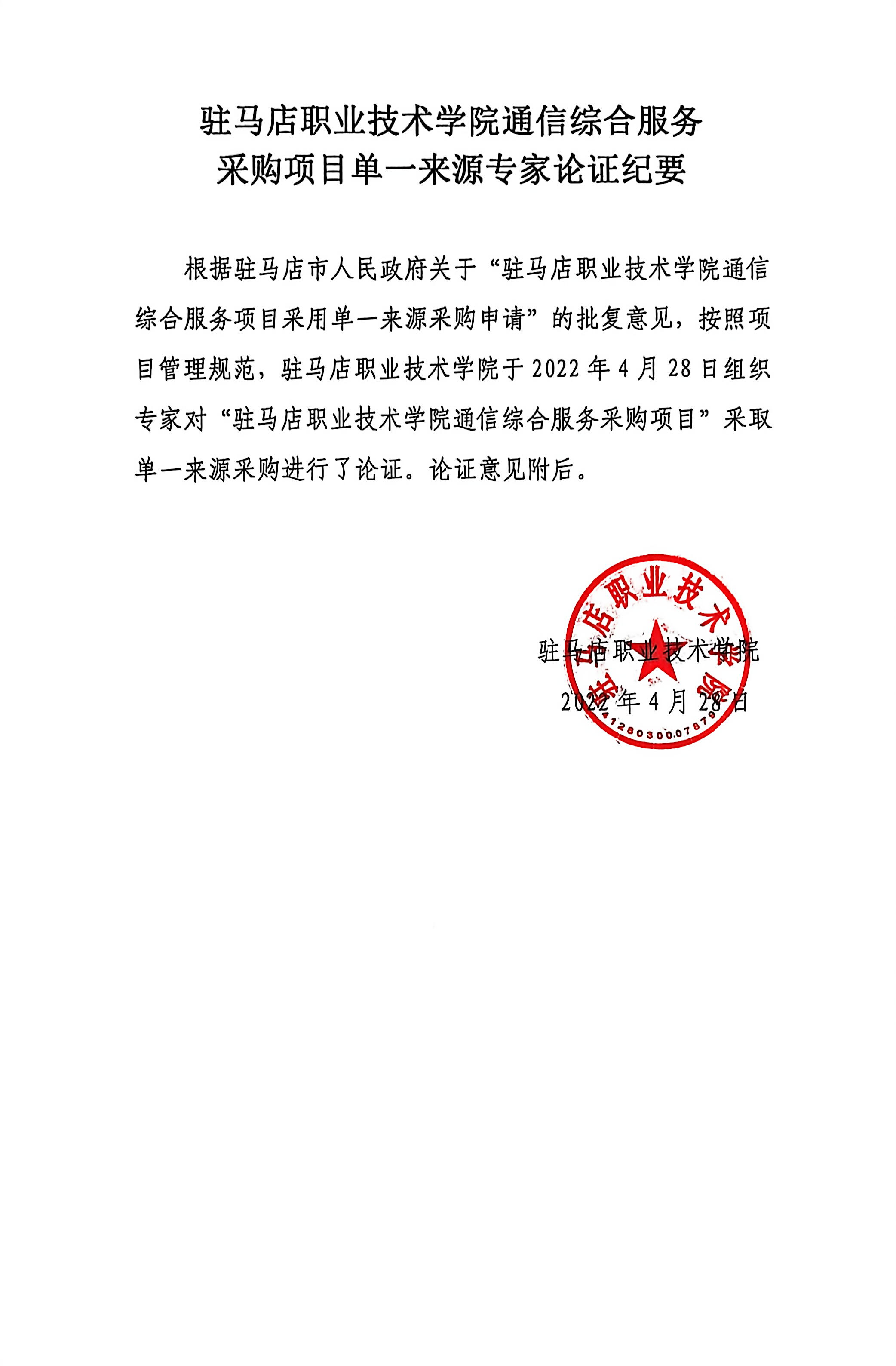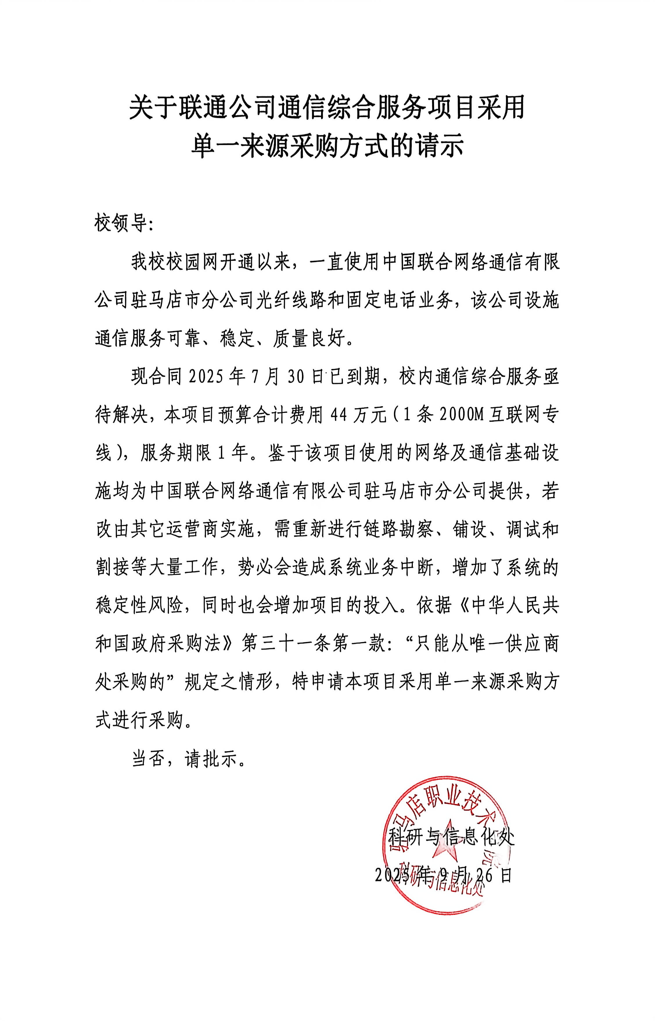 | 该项目使用的网络及通信基础设施均为中国联合网络通信有限公司驻马店市分公司提供,若改由其它运营商实施,需重新进行链路勘察、铺设、调试和割接等大量工作,势必会造成系统业务中断,增加了系统的稳定性风险,同时也会增加项目的投入。依据《中华人民共和国政府采购法》第三十一条第一款:“只能从唯一供应商处采购的”规定之情形,特申请本项目采用单一来源采购方式进行采购。本项目预算合计费用**万元(*条*****互联网专线),服务期限*年。 | ||||||||||||||||