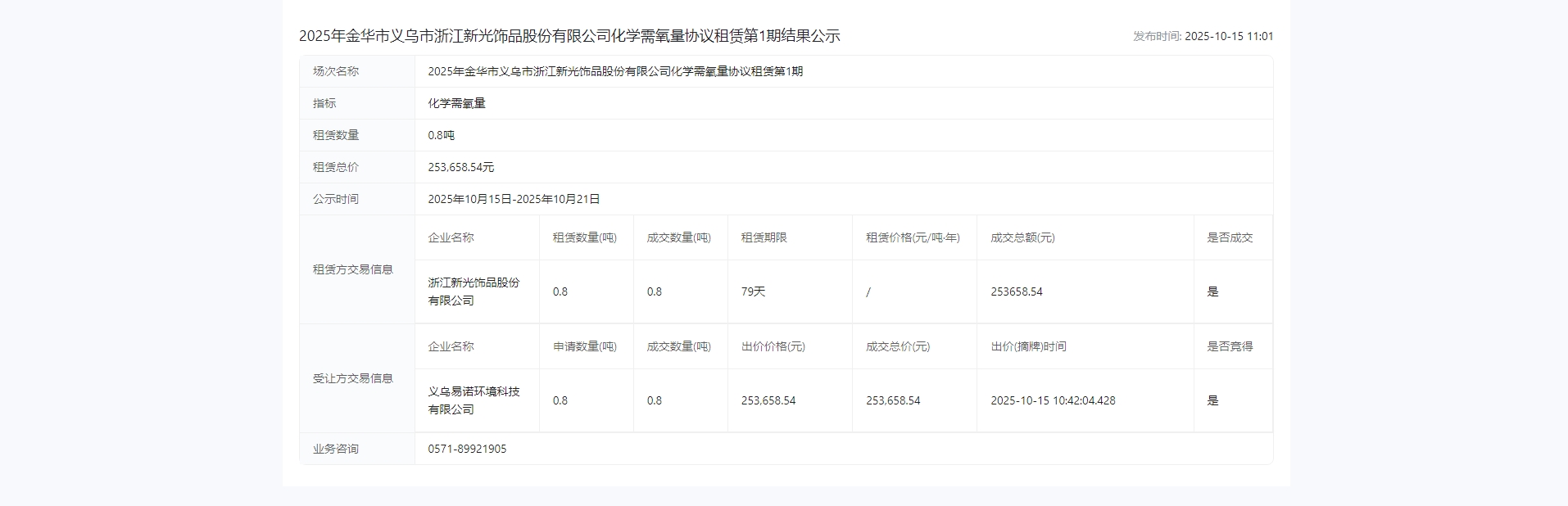 华市义乌市浙江新光饰品股份有限公司化学需氧量协议租赁第1期结果公示
