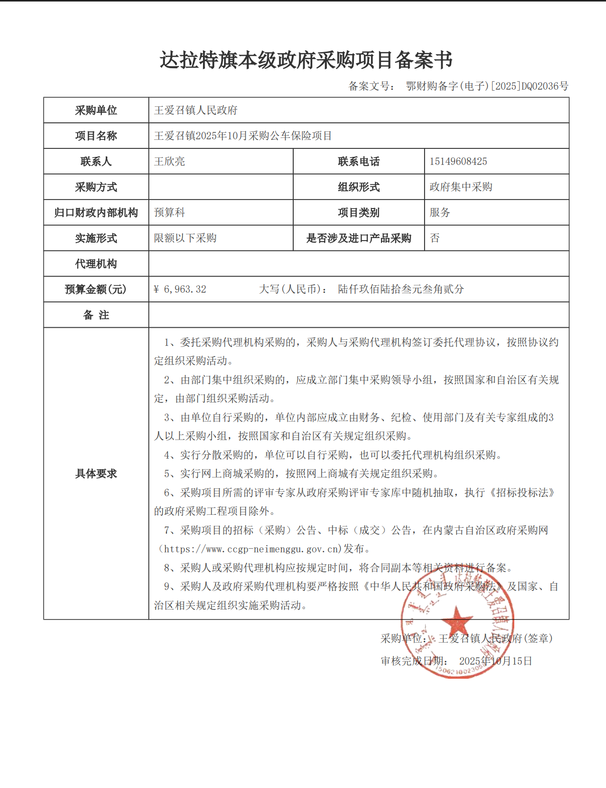 王爱召镇人民政府王爱召镇2025年10月采购公车保险合同政府采购合同公告