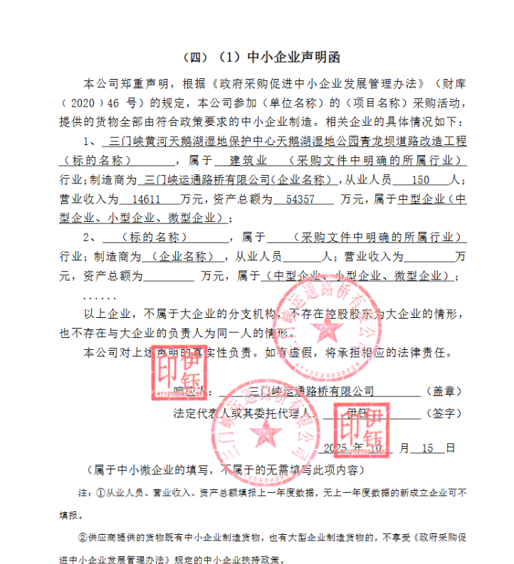 三门峡黄河天鹅湖湿地保护中心天鹅湖湿地公园青龙坝道路改造工程项目*成交公告