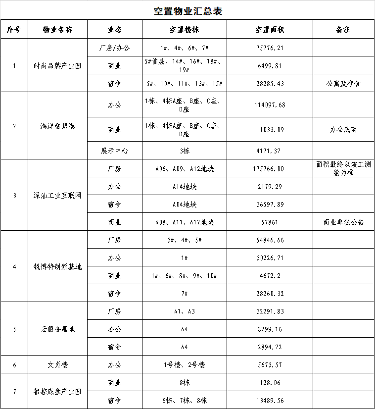 根据《深圳市深汕国际汽车城(集团)有限公司资源性资产租赁管理办法(第二次修订)》规定,现发布招商项目****年**月征集意向承租方公告,包含时尚品牌产业园剩余厂房、研发办公、商业、宿舍;海洋智慧港剩余研发办公、商业、展示中心;深汕工业互联网酒店、商业、一期厂房、宿舍、二期厂房;深汕锐博特西区厂房、办公、商业、宿舍;云服务基地剩余厂房、办公、宿舍;文贞楼剩余办公;创业村剩余商业;辉煌花园剩余商业;开元大厦剩余商业;临邦里剩余商业、智控底盘产业园剩余商业、宿舍;深汕西文体中心剩余商业。具体如下:
