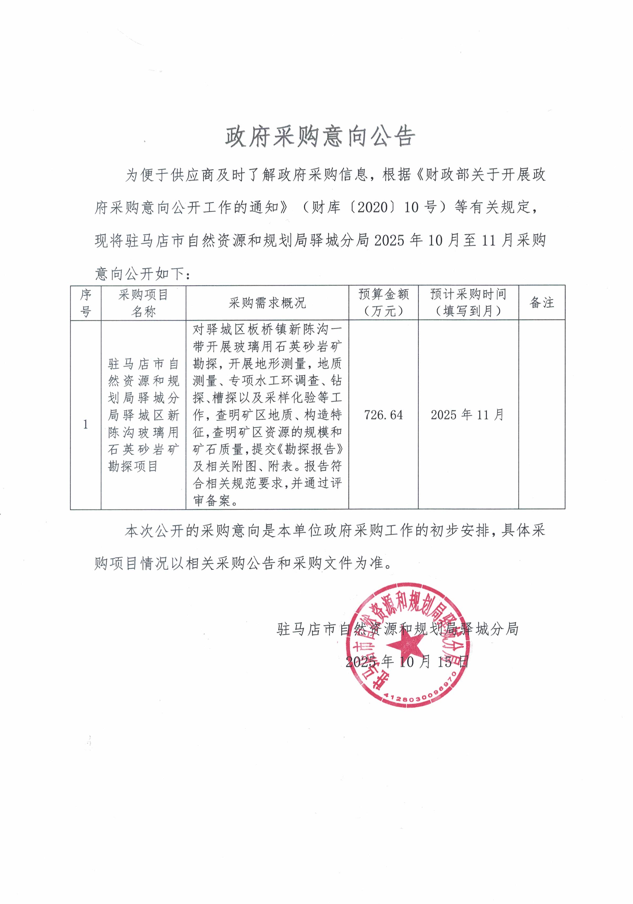 驻马店市自然资源和规划局驿城分局2025年10至11月政府采购意向