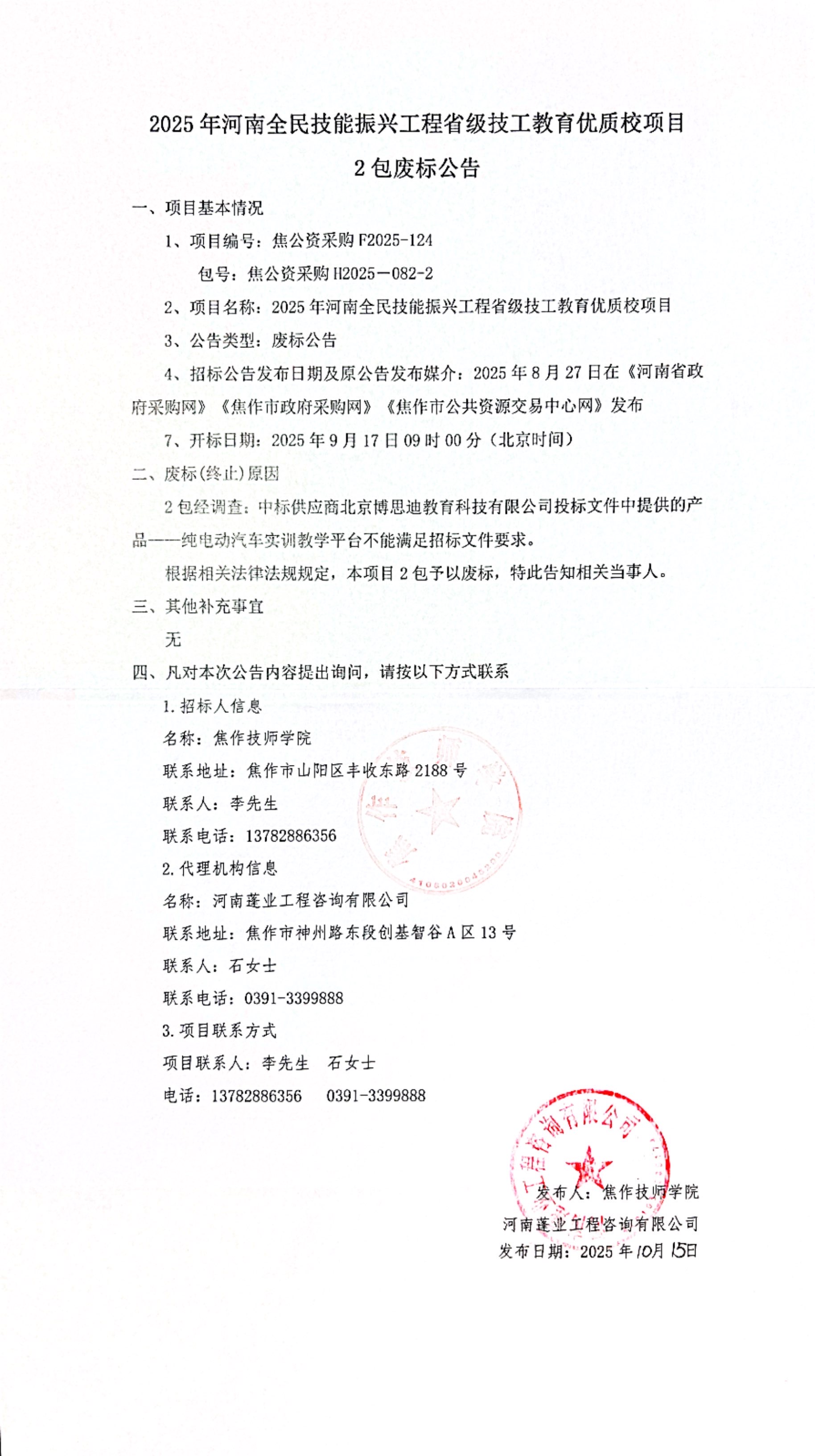 2025年河南全民技能振兴工程省级技工教育优质校项目2包废标公告