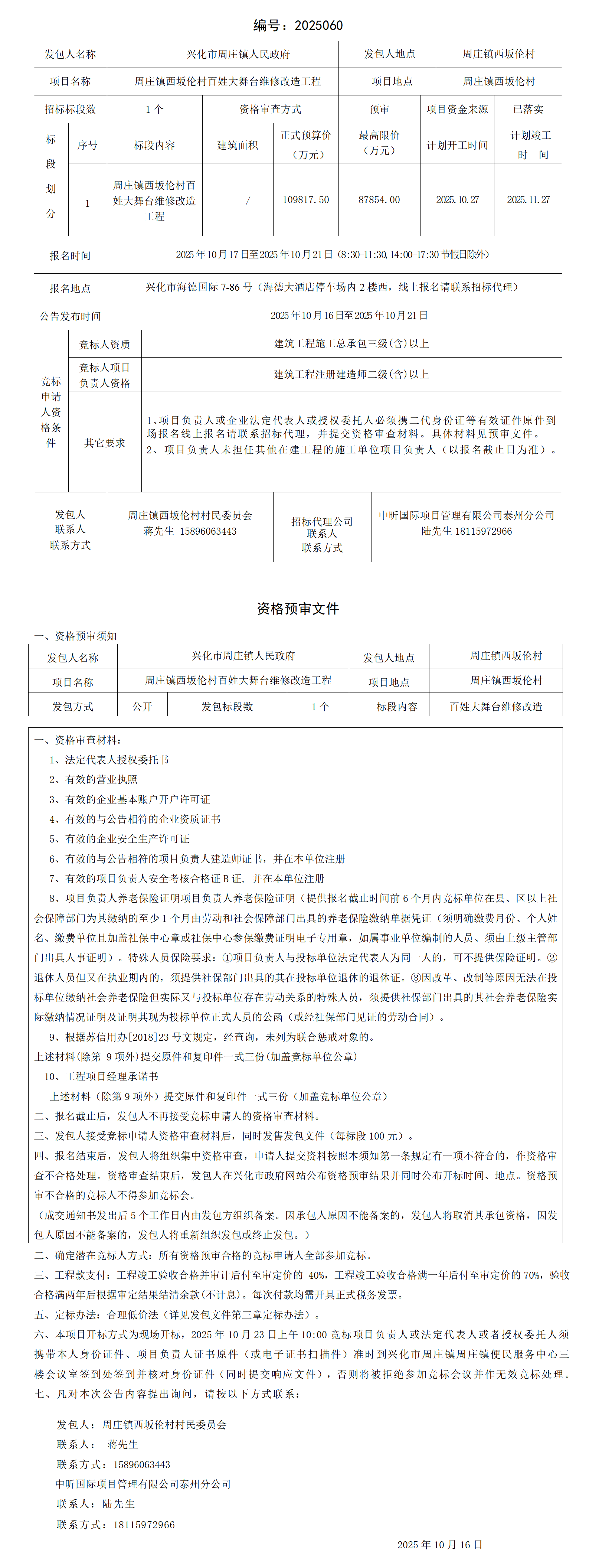 镇西坂伦村百姓大舞台维修改造工程发包公告